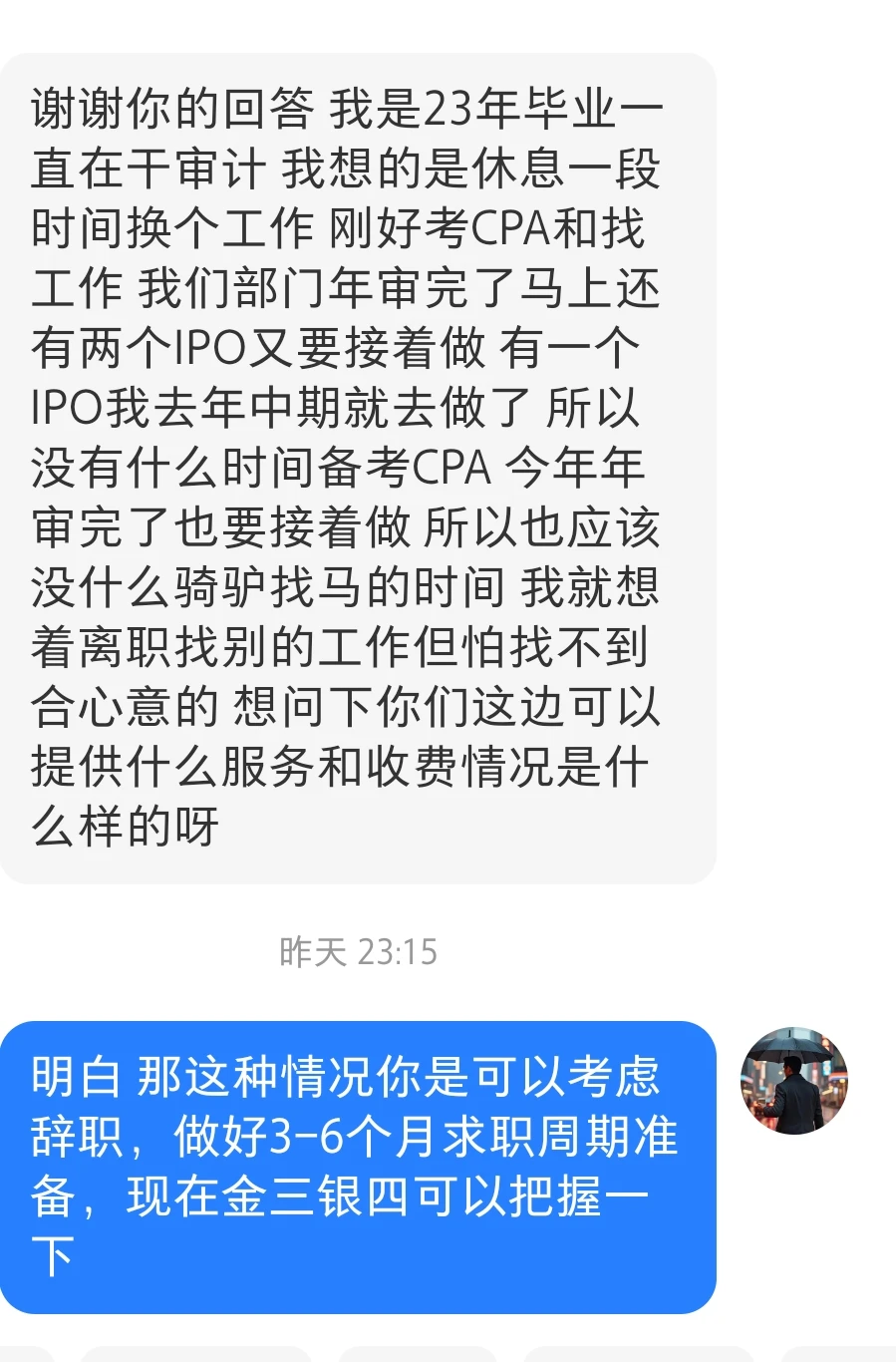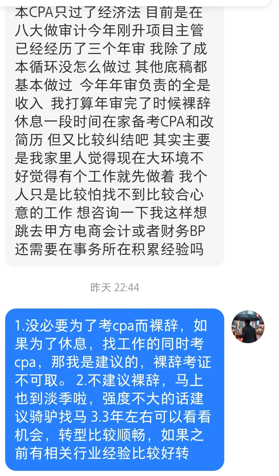 回复:1.没必要为了考cpa而裸辞,如果为了休息,找工作的同时考cpa,那我是建议的,裸辞考证不可取。 2.不建议裸辞,马上也到淡季啦,强度不大的话建议骑驴找马 3.3年左右可以看看机会,转型比较顺畅,如果之前有相关行业经验比较好转