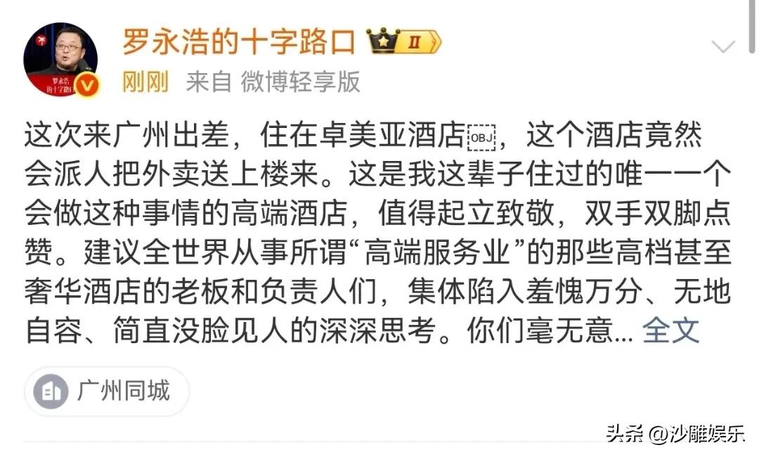罗永浩,深夜破防怒赞! 3月18日的深夜,当大多数人已经进入梦乡时,我们的“行业冥灯”兼“顶级嘴替”罗永浩老师,突然在社交媒体上“发飙”了。 不过别紧张,这次老罗不是要开新品发布会,也不是要吐槽友商,而是因为一份外卖,直接把一家酒店捧上了天——广州卓美亚。 老罗这次来广州出差,住进了珠江新城的卓美亚。像咱们这种经常出差住酒店的老油条都懂,哪怕你住的是五千一晚的奢华套房,到了深夜馋虫上脑点个烧烤,结局往往都是:自己裹紧睡衣,顶着电梯里的镜子,灰溜溜地滚下楼去大堂自取。 这似乎成了高端酒店心照不宣的“潜规则”——怕担责、怕麻烦、怕影响“高端”人设。 可这次,剧本没按套路走。当老罗正准备下楼当“取餐员”时,卓美亚的工作人员居然主动把外卖送到了他的房间门口。 这一下,见惯了大场面的老罗直接破防。他在微博里毫不吝啬溢美之词,直呼“这辈子第一次见”,甚至用了“值得起立致敬,双手双脚点赞”这种顶级词汇。最后还不忘地图炮一把,让全球高端酒店从业者都来看看,什么叫“羞愧到无地自容”。 说白了,老罗戳破的其实是高端服务业那层虚伪的窗户纸。 很多五星级酒店,仪式感拉满:门口有人开车门,大堂有人弹钢琴,check-in有人递毛巾。但当你真的想喝口热汤、想吃口深夜的慰藉时,往往得到的是一句冰冷的:“抱歉先生,为了安全,外卖不能送上楼。” 所谓的高端,如果连最基本的“方便”都给不了,那和住展览馆有什么区别? 而卓美亚这次的操作,看似只是多走了一步,实则是把“客人的真实需求”放在了“酒店的规章制度”前面。正如老罗所说,这才是服务的真谛。 网友吵翻了: - 有共鸣的网友:“说得太对了!上次住某国际连锁,零下几度的天,愣是让我穿着单衣下楼拿外卖,说是怕弄脏地毯,我当时真想给他一个差评!” - 有过来人现身说法:“卓美亚的粉真的懂!他家不止送外卖,上次半夜饿得睡不着,管家直接送了广式糖水到房间,那碗陈皮红豆沙,比任何山珍海味都治愈。” - 有理性分析的:“其实不是酒店不能送,是愿不愿担责。怕外卖员上楼有隐患,那能不能培养自己的管家送?卓美亚用24小时管家和机器人配送标配解决了这个问题,这才是动脑子做服务的。” 在这个酒店行业疯狂内卷硬件(床品、备品、景观)的时代,大家往往忘了,服务的本质是看见人。 罗永浩这波怒赞,表面是夸一份外卖,实则是对当下许多高端酒店“重形式、轻体验”的一种打脸。你花几个亿装修大堂,不如在客人需要的时候,递上一口热乎的。广州卓美亚这一波操作,简直是给自己立了个价值几个亿的广告牌——连罗永浩这种“细节控”都能征服,你还怕搞不定那些挑剔的客人吗? 希望老罗这一嗓子,能喊醒那些还在让客人下楼取餐的“高端酒店”。毕竟,真正的奢华,是让人舒服,而不是让人敬畏。