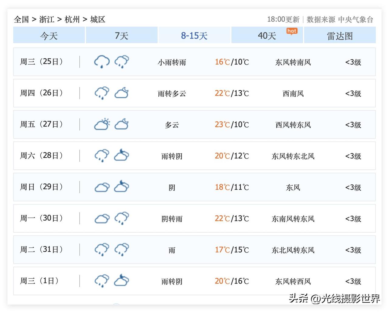 太令人惊喜啦!杭州终于要出太阳啦!老天爷给杭州人送福利啦!3月19日到22日,杭州,多云晴好,天气可能好到爆炸!非常适合大家去西湖边踏青赏花,欣赏吉野樱花……太子湾,曲院风荷,花港观鱼……特别特别好啊! 苏堤春晓,白堤桃红柳绿…… 3月21日,星期六,杭州多云,气温10-13度。 3月22日,星期天,白天,杭州多云,晚上中雨。 杭州的小伙伴们,一定要抓住这几天的杭州春色巅峰高潮啊! 错过,可能真的再等一年啊! 3月23日,星期一,杭州中雨转小雨。 3月24日,星期二,杭州小雨。 中央气象台最新杭州天气预报,让人感动! 所以,必须要珍惜啊!杭州,南京,未来几天,桃花,樱花,郁金香,桃红柳绿,杨柳如烟……太美啦!