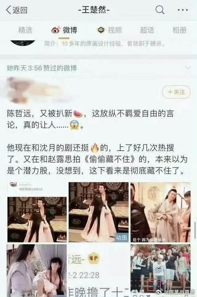 网传陈哲远和王楚然要合作了,之前王楚然还点赞过陈哲远的黑帖好尴尬 。