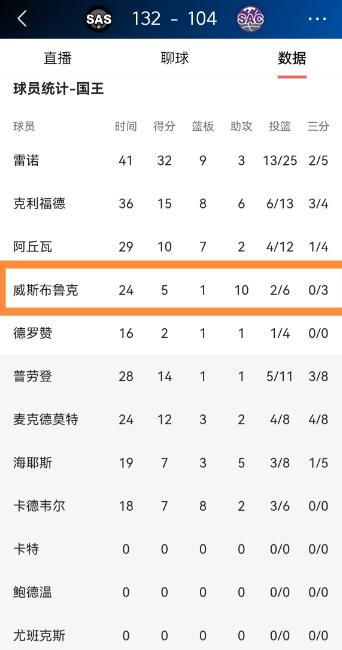 国王老将威斯布鲁克真是痴迷于刷助攻!在今天国王主场以104:132惨败于马刺的比赛中,威少将自己渴望刷助攻的心情展现的淋漓尽致。 3月18日NBA常规赛,国王主场对阵马刺,最终国王以104比132大比分输掉比赛,这场比赛里,老将威斯布鲁克的表现,把他对助攻的执着展现得很明显。 比赛从一开始,国王就陷入被动。马刺首节就拿到39分,国王只得到22分,分差直接拉开,威斯布鲁克首发出场,从开场就把主要精力放在传球上,他很少主动出手投篮,拿到球后第一反应就是观察队友位置,寻找传球机会。 不管是突破到内线后的分球,还是外线持球时的转移,他都在刻意找能形成助攻的传球线路。 上半场比赛,马刺进攻火力全开,半场结束时已经78比47领先国王31分,比赛早早失去悬念。 在这样大比分落后的情况下,威斯布鲁克没有改变打法,依旧专注于传球,第二节比赛中,他送出一次助攻后,生涯总助攻数完成对马克·杰克逊的超越,之后又凭借一次传球追平并超越纳什,升至NBA历史助攻榜第五位。 达成这个里程碑的过程里,他的传球选择更偏向于能直接转化为助攻的线路,个人进攻几乎被放在一边。 整场比赛,威斯布鲁克出战25分钟左右,出手次数很少,大部分时间都在组织传球。 他的传球很积极,不管球队落后多少分,都在持续给队友送球,试图通过助攻带动队友。 队友接球后的出手,他也会第一时间关注是否命中,每完成一次助攻,都能看出他的投入感。 相比之下,他的个人进攻欲望很低,很少主动发起攻击,即便有不错的出手机会,也会优先选择传球。 国王队本场比赛,只有新秀雷诺表现突出,拿到全队最高的分数,其他球员得分都比较零散。 威斯布鲁克全程专注于助攻,没有用个人得分去帮助球队缩小分差。球队大比分落后,他也没有调整策略,依旧执着于通过传球完成助攻数据的积累。 比赛末节,胜负早已确定,双方都换上替补阵容练兵。威斯布鲁克依旧留在场上,继续寻找助攻机会,直到比赛结束,他一共送出10次助攻,完成了生涯助攻数的里程碑时刻。 这场惨败的比赛里,他的所有行动都围绕着助攻展开,对助攻的痴迷贯穿全场,个人数据里助攻是唯一亮眼的部分,得分和篮板都没有太多贡献。 赛后,国王官方社媒还把头像换成了威斯布鲁克的照片,纪念他助攻数升至历史第五的成就。 但这场比赛,国王主场大比分输球,威斯布鲁克全程专注于助攻的表现,也让他对助攻的执着,在这场惨败里被看得格外清楚。 以上都是个人观点,对此您有什么不同的看法,可以在评论区留言讨论!!!