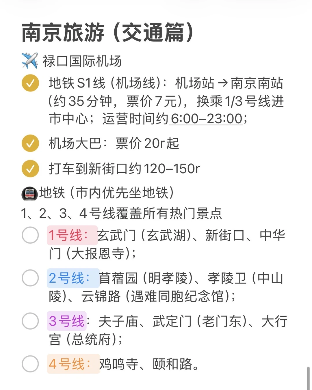 ✔️地铁S1线(机场线):机场站→南京南站(约35分钟,票价7元),换乘1/3号线进市中心;运营时间约6:00–23:00;