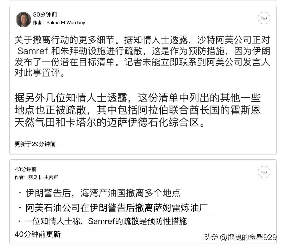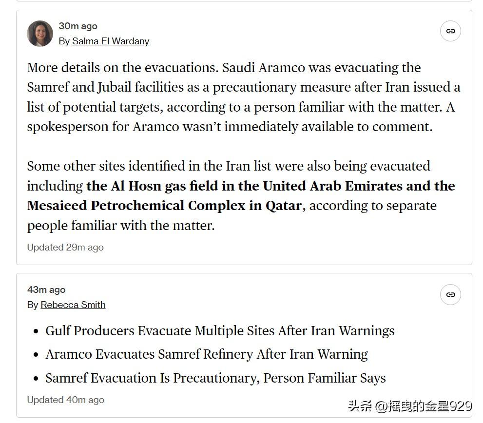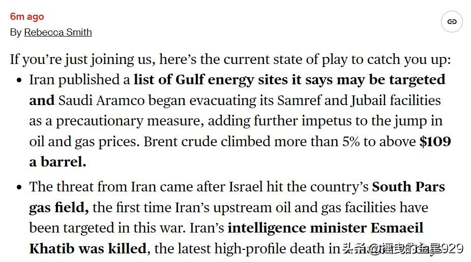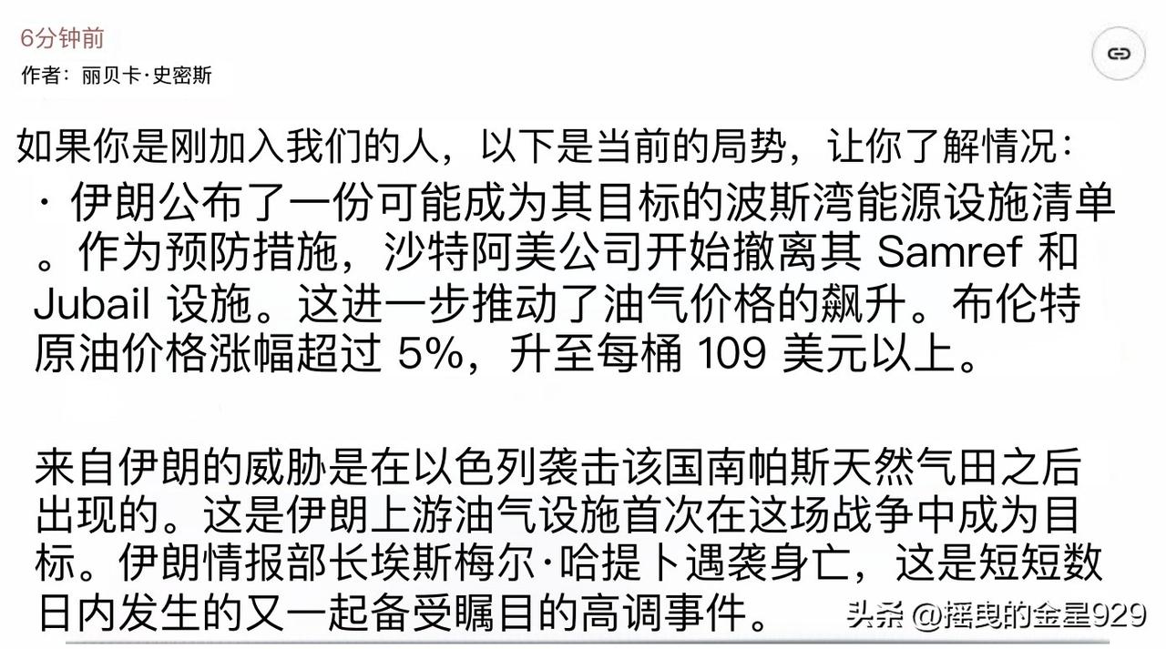 以色列袭击了伊朗的南帕尔斯气田,这是伊朗上游石油和天然气设施在此次战争中首次成为攻击目标。 伊朗随后发布警告,并公布了一份海湾能源设施名单,称这些设施可能成为攻击目标。其中包括沙特阿拉伯、卡塔尔和阿联酋境内的石化设施。 据知情人士透露,在伊朗发布这些潜在目标清单后,沙特阿美石油公司作为预防措施,正在疏散萨姆雷夫和朱拜勒设施。阿美公司发言人未能立即置评。 据其他知情人士透露,伊朗清单中确定的其他一些地点也在进行疏散,包括阿联酋的阿尔霍斯恩气田和卡塔尔的梅赛义德石化联合体。 伊朗革命卫队海军司令表示,鉴于对伊朗能源设施的袭击,伊朗的目标库已更新——凡是与美国相关的石油设施,将受到与美军基地同等对待,将遭到猛烈打击。 革命卫队还警告海湾公民和工人远离与美国相关的石油设施。 与此同时,这一系列的紧张关系,进一步推动了石油和天然气价格的飙升。布伦特原油价格上涨超过 5%,突破每桶 109 美元。 以色列特拉维夫国家安全研究所的中东问题专家约埃尔.古赞斯基表示,以色列对伊朗南帕尔斯气田相关设施的袭击,标志着美以两国针对德黑兰的军事行动进入了“危险的升级阶段”。这一举动可能对地区的能源基础设施以及全球市严生深远影响。 这次袭击可能具有战略意义一一甚至可能成为这场战争的转折点。其原因并非在于该设施对伊朗有多重要,尽管它确实很重要。 而是因为这是伊朗的天然气设施首次遭到如此严重的打击。” 他补充说:“伊朗完全有能力袭击海湾国家的石油和天然气设施,而且现在很可能会选择这么做。这将把战争推向一个新的阶段,对国际市场以及海湾国家出口石油和天然气的能力造成严重冲击。 这样的发展态势反过来可能会引发美国和以色列的进一步反应,他们可能会对伊朗更重要的石油设施发动攻击——其中最有可能的目标就是哈尔克岛。因此,这很可能会导致战争局势升级。” 与此同时,外界普遍认为,如伊朗对海湾国家重要能源基础设施发动袭击,极为容易引起周边国家误判形势,将联合起来对抗伊朗的袭击,甚至与伊朗发生直接冲突,而这一切的源头是来自于美国与以色列对伊朗油气田的袭击。