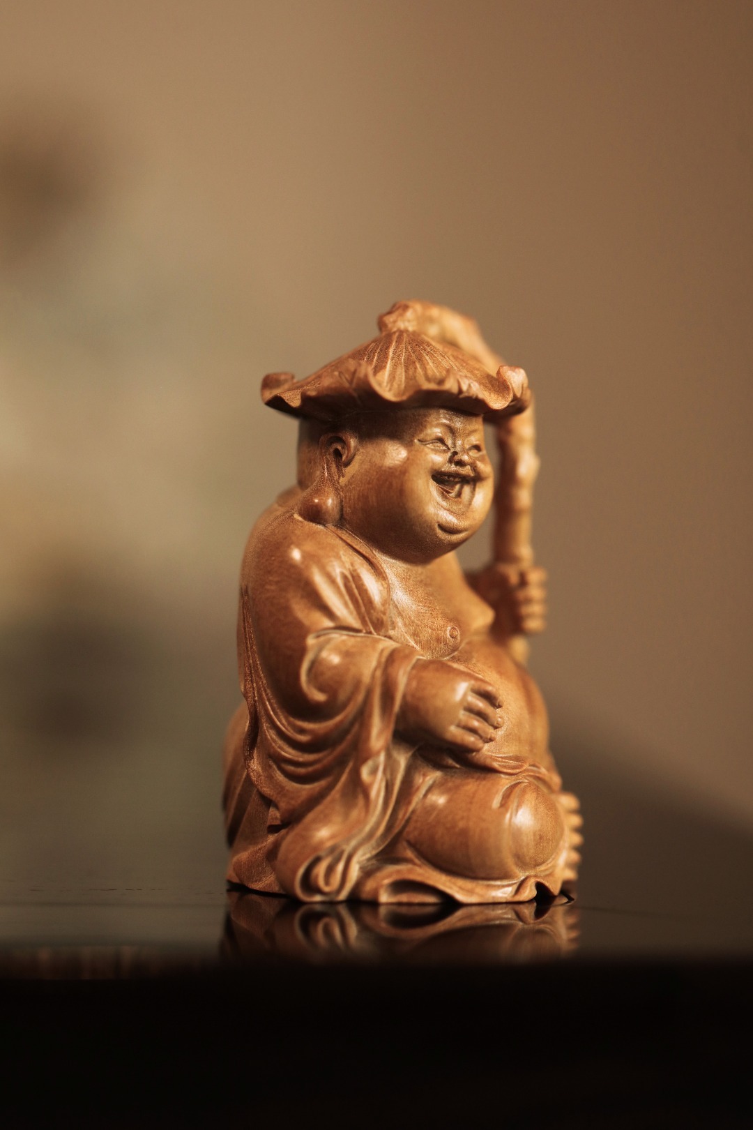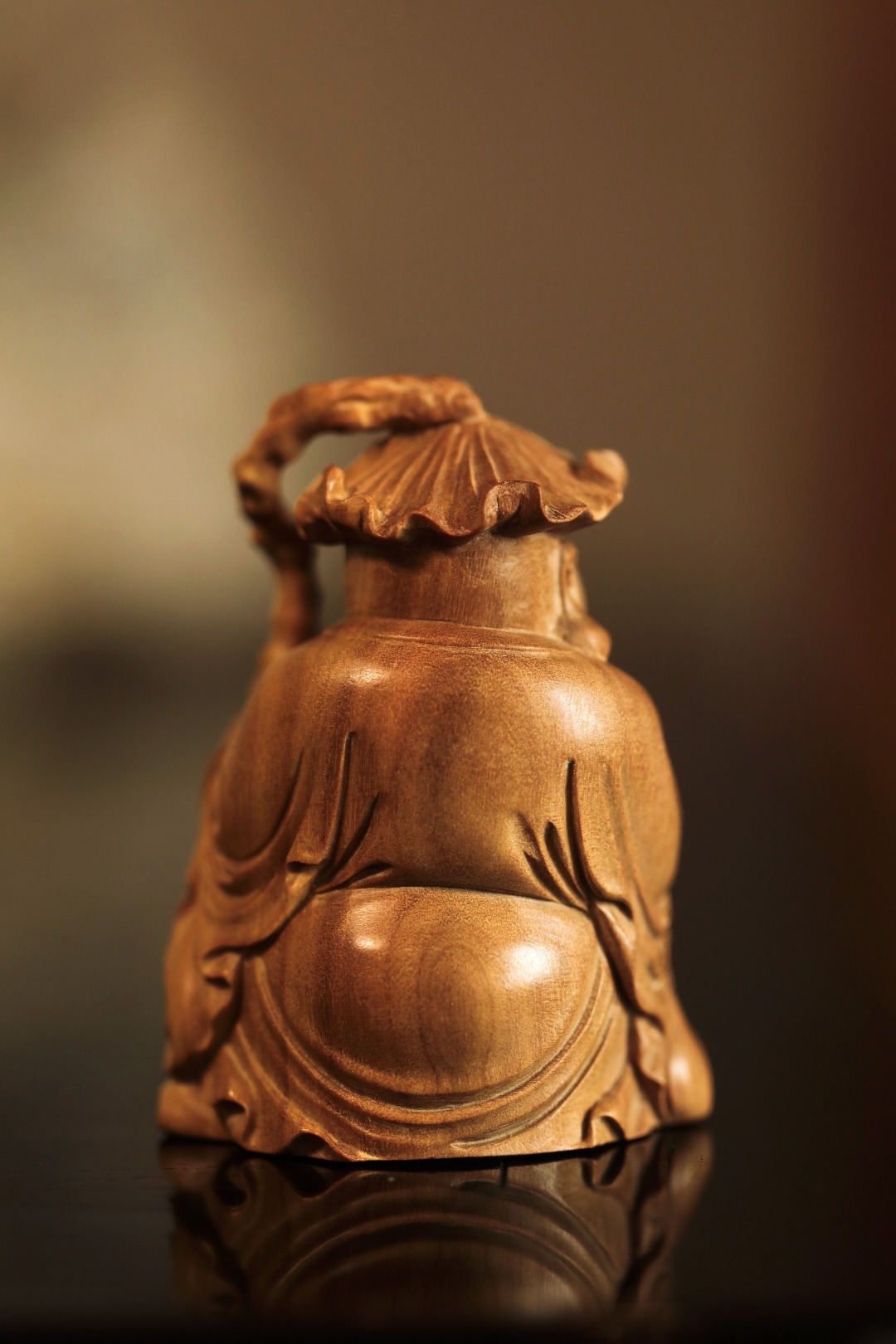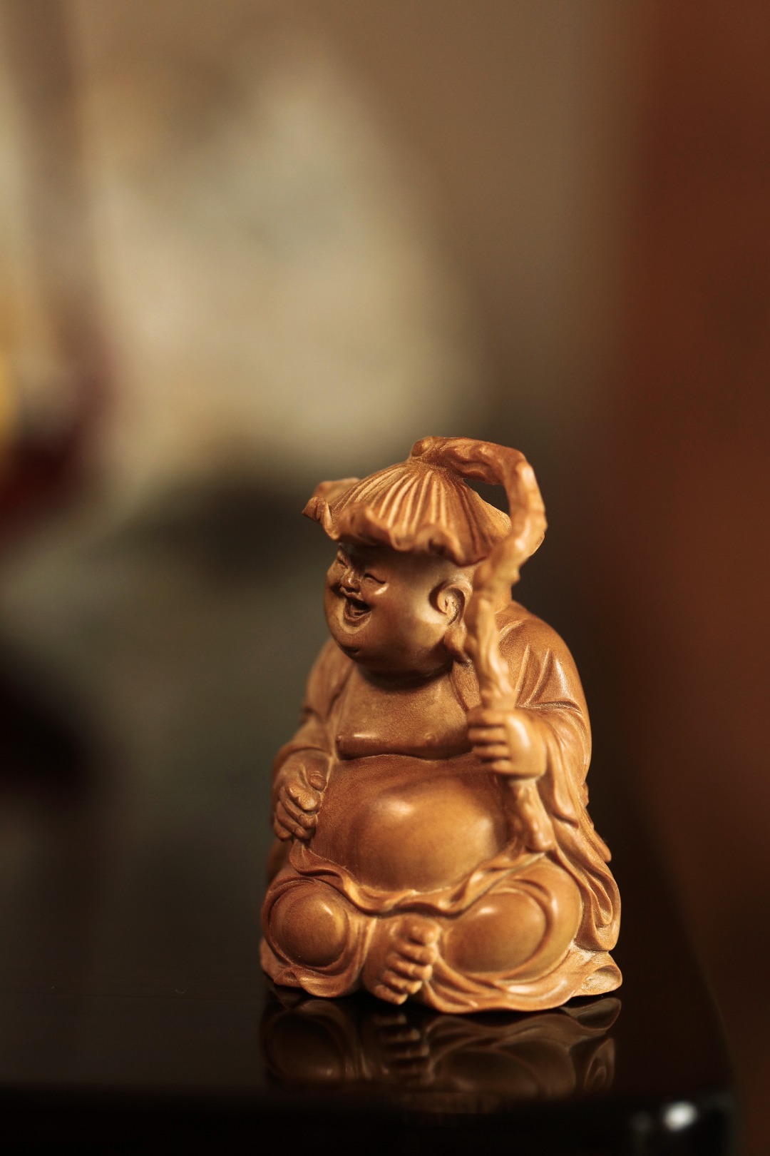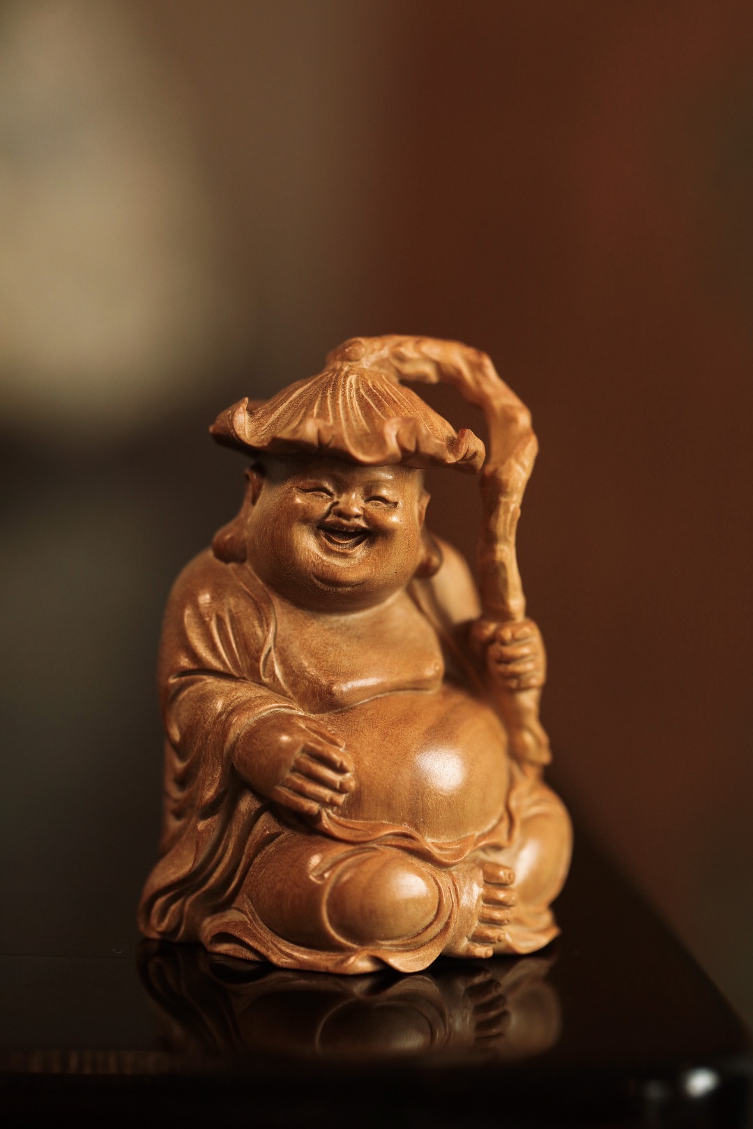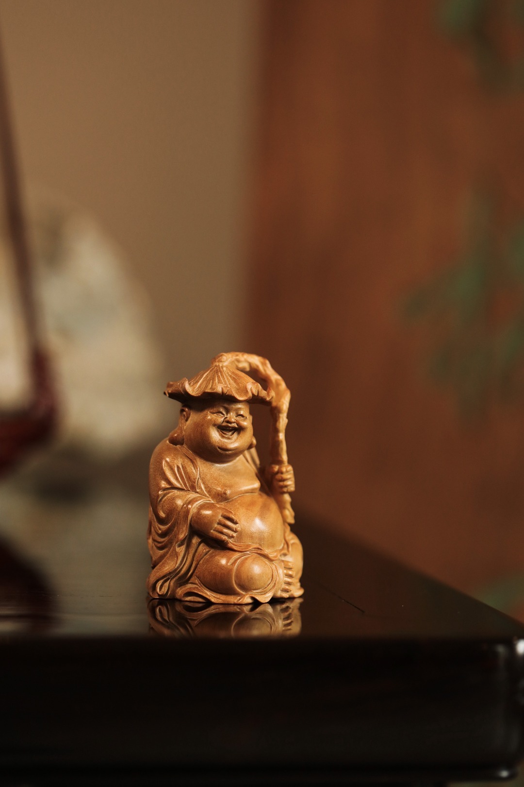 择老山檀香一木雕成,情态生动传神,弥勒禅坐头戴荷叶,喜笑颜开,置案摆放,和气生财,颇增趣味。