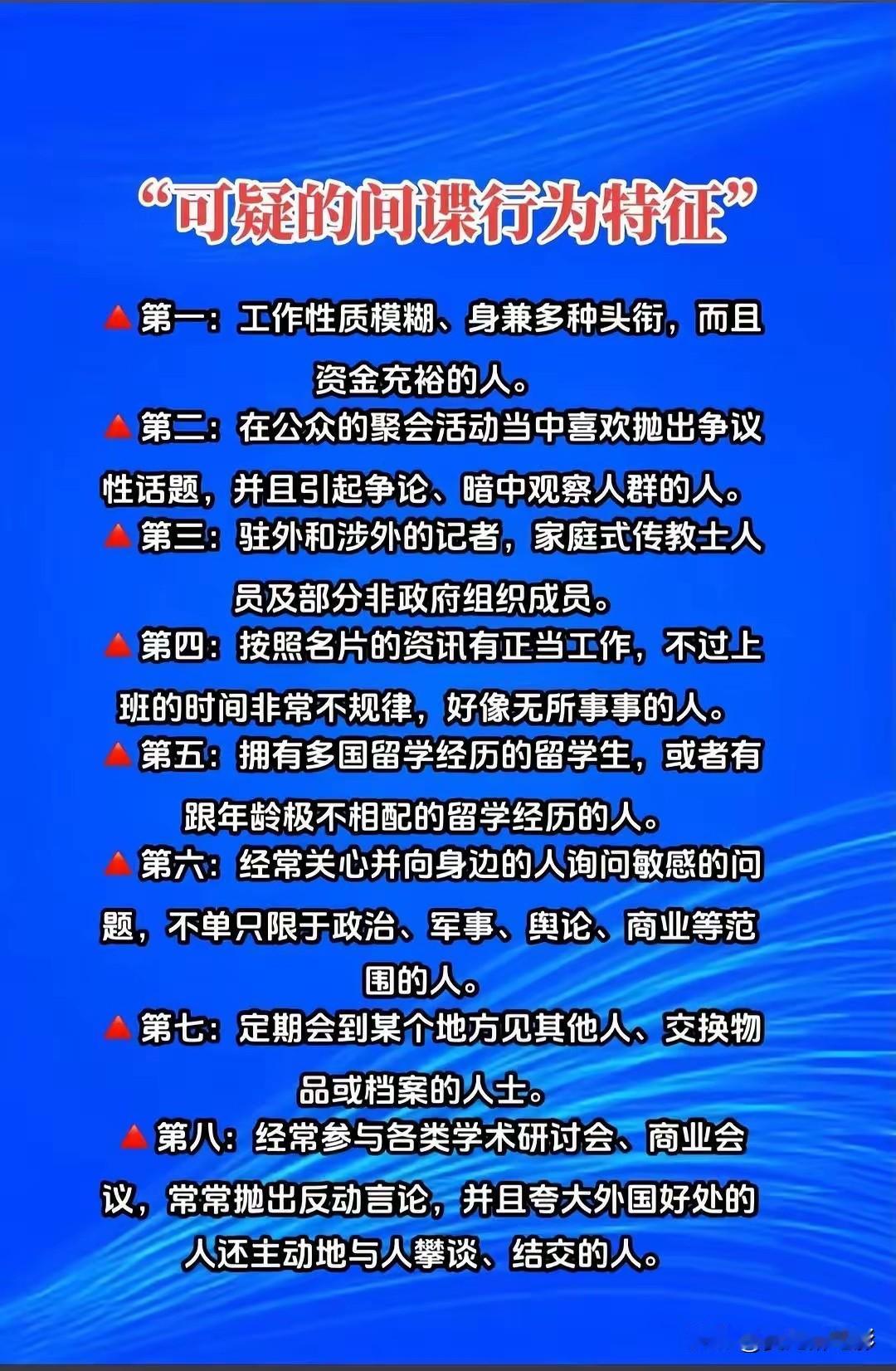 认真看完…传递下去,时刻留意,让更多国人加入反间谍队伍当中!肃清间谍,彻底消灭敌人! 间谍离我们远吗?不远,可能就在身边。 间谍是啥?就是偷偷收集我们国家情报,然后卖给外国的人。他们盯着的,可能是咱们的军事机密,也可能是重要的经济信息,或者是高科技技术。 有人说,抓间谍是安全部门的事,跟老百姓没关系。这话不对。国家安全,人人有责。普通人也能发挥大作用。 为啥?因为间谍要活动,总会有痕迹。他们得和人接触,得收集信息。这些事,发生在日常生活中。 咱们普通人能做什么?很简单,多留个心眼。 比如,在公园、军事基地附近,看到有人长时间拍照,特别是拍一些不让拍的地方。这时候就得想想,他是不是在搞测绘,收集地理信息? 又比如,有人总是打听他工作之外的事。特别是那些在重要单位上班的人,如果被陌生人套近乎,问东问西,就要警惕。他是不是想套取内部消息? 还有那些所谓的“项目合作”、“学术交流”,如果对方总想拿到核心数据或文件,也得小心。这可能是在窃取技术。 网友说的对,关键岗位上的人尤其要管好自己。他们知道的秘密多,是间谍最想靠近的目标。 以前咱们的保密工作做得好,重要科研人员身份都不公开。现在信息透明了,但保密意识不能丢。该保密的,必须守口如瓶。 看见可疑的人和事,不用你去抓。最应该做的,是记下来,打12339这个电话举报。这是国家安全机关的举报电话。你的一个电话,可能就保护了重要的国家秘密。 反间谍,不是为了制造紧张。恰恰相反,是为了让咱们大家都更安全。国家没有秘密被偷走,技术不被盗用,咱们的日子才能过得更安稳,发展得更好。 这就像一大家子过日子,得防着外贼来偷东西。每个人都看紧点门户,这家才安全。国家就是我们共同的家。 肃清了间谍,消灭了隐患,咱们心里才踏实,国家发展的路才走得更稳。这份安稳,离不开我们每个人的那一点留意和警惕。