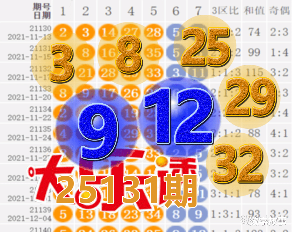 大乐透25131期开奖结果及中奖情况:出奖时间: 2025-11-17 星期一 前区号:3-8-25-29-32后区号:9-12大乐透前区重号叠码:29前区隔期下落:3前区奇偶比:3:2 前区和值:97前区跨度:29 三区比:2:0:3没有连号