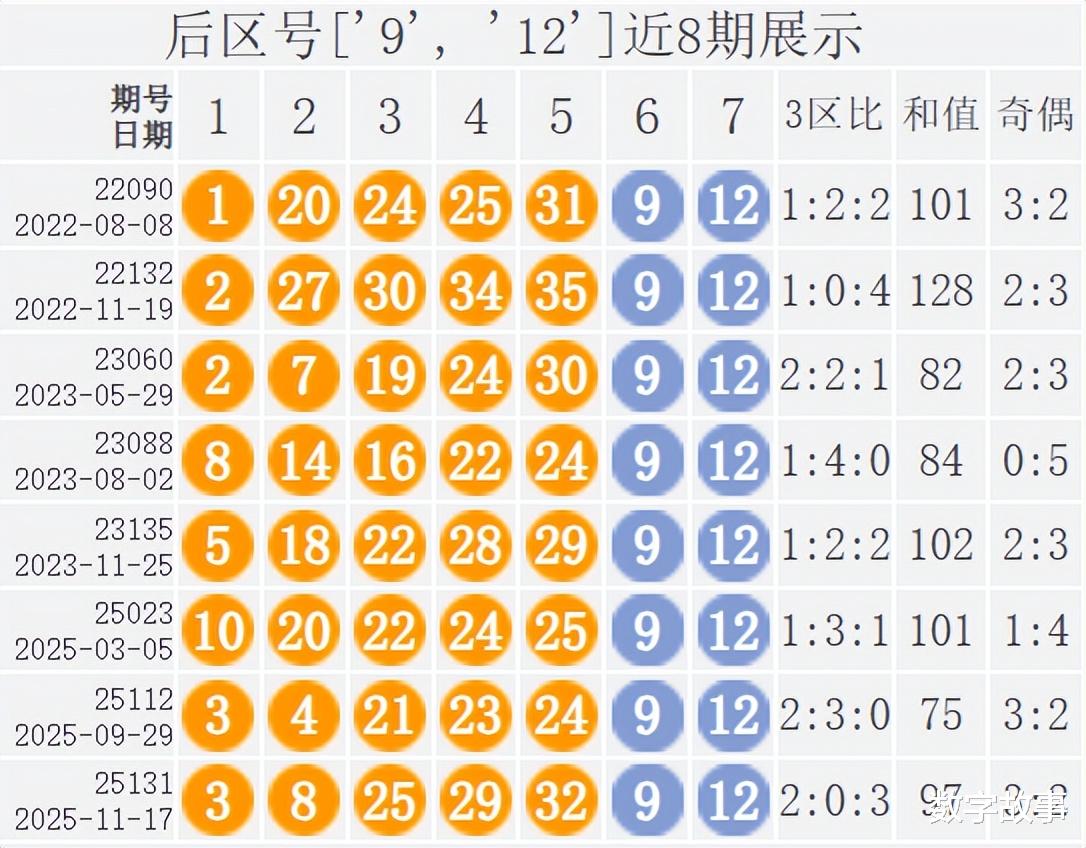 大乐透后区含9或12的双号遗漏次数统计大乐透后区组合9-12近150期出了3次,这次中断了18期遗漏。