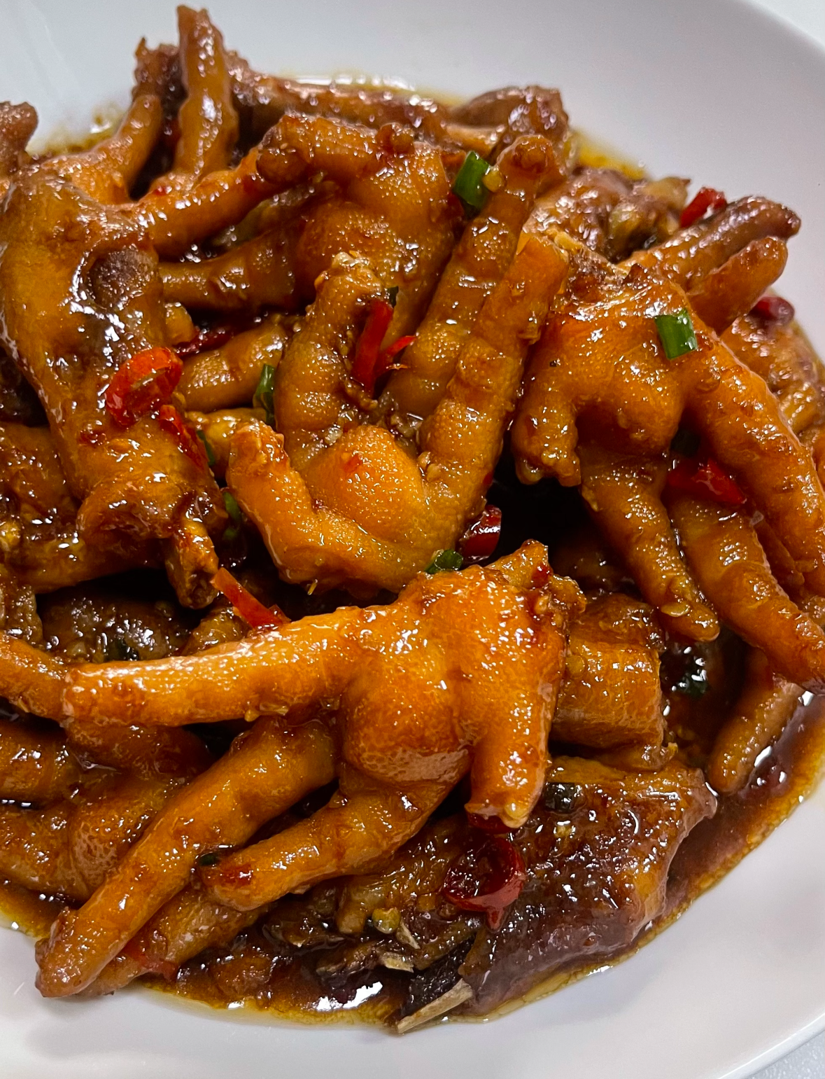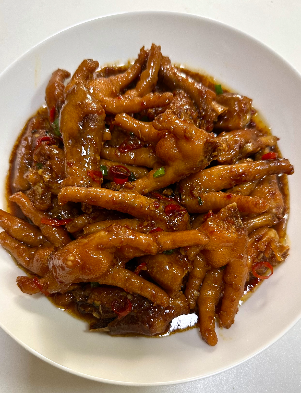 如果人多,顺手往锅里加一把土豆块或年糕,它们比鸡爪还会吸汁;剩汤汁第二天煮豆腐、煮白菜,平平无奇的素菜立刻拥有川菜灵魂。唯一要注意的是:做完记得开窗通风,否则第二天楼道里还飘着蒜香,全楼的猫都会来你家门口蹲点。总之,这锅鸡爪把“下饭”俩字写进了DNA,啃完别舔手指——因为根本舔不够。