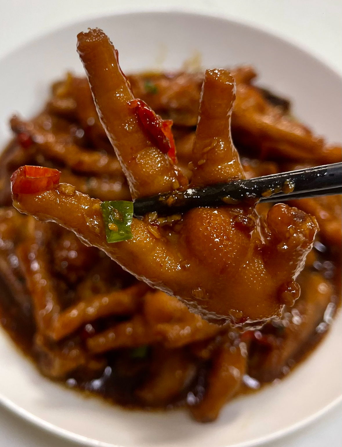 端锅上桌,先别急着夹鸡爪,舀两勺汤汁浇在白米饭上,米粒瞬间裹上红油,亮晶晶的像给米饭涂了唇釉。啃鸡爪的正确姿势是:嘴巴咬住趾尖,牙齿轻轻一扯,骨头“啵”地弹出,完整脱骨,剩下整块弹糯的掌中宝,嚼两口,胶质把上下唇粘在一起,幸福感爆棚。吃到后半程,汤汁渐渐变凉,表面凝成一层胶冻,别倒掉,晚饭下面条时加一勺,秒变豪华版蒜泥红油面。