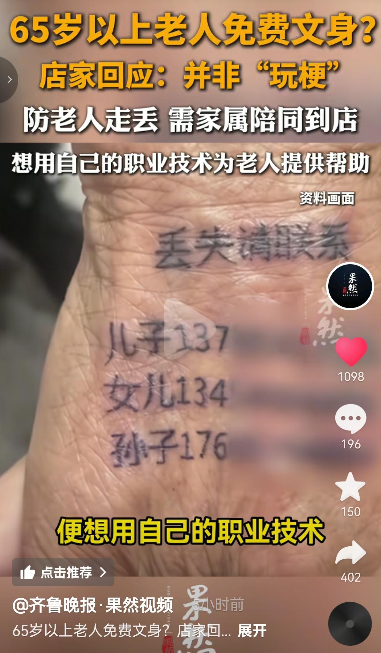 65岁老人免费文身被骂“糟蹋老人”!真相曝光后,所有人都沉默了 你见过家人走失后,全家疯找的样子吗? 广东揭阳一家文身店挂出红横幅:65岁以上老人凭身份证免费文身!一开始我还以为是博眼球的噱头,可看完真相,鼻子瞬间酸了——这哪里是文身,这分明是刻在老人皮肤上的救命符! 3月17日,这条横幅突然火了,不少人跳出来骂:“给老人文身太糟蹋人”“肯定是想博眼球”。可当老板说出初衷,所有质疑声都哑了: 他见过太多走失的老人,兜里的联系卡丢了、手机没电关机,连自己名字和家在哪都记不清,家属抱着照片在派出所哭到崩溃,整夜整夜在街上疯找。他思来想去:号码牌会丢、手机会没电,只有文在身上的电话,才最稳妥。 于是他下定决心,用自己的手艺,免费给65岁以上老人纹上家属联系信息,还特意规定必须家人陪同到店——既尊重老人意愿,也怕糊涂的老人乱纹出意外。哪怕顶着骂声、赔着成本,他也没动摇:“就怕万一老人走丢了,有人能一眼看到电话,把他们送回家。” 网友看完直接炸了,有的网友说:“我奶奶走失过三次,口袋里的纸条全丢了!要是早有这,我爸也不会熬几个通宵找老人!这才是真真正正的行善!” 也有的网友说:“别纠结好不好看了,能让老人平安回家,比什么都重要,这是救命的印记!” 也有的网友说:“看着太暖心了,老板是在用自己的手艺守护老人,比空喊关爱老人实在太多!” 还有的网友说: “现在愿意真心实意帮老人的人不多了,这位老板值得我们所有人点赞。” 看完这件事,我心里特别感慨。 我们总在朋友圈喊“关爱老人”,可真正落到实处的善意,却常常被误解、被指责。 那些质疑的人,可能没体会过家人走失的焦虑,没见过老人站在街头茫然无措的眼神,也没熬过家属四处寻人、彻夜未眠的夜晚。比起文身好不好看,平安和团圆,才是一个家庭最在乎的事。 我们总说要传递温暖,可真正的关爱从来不是口号,是老板扛着骂声也要做的免费文身,是刻在皮肤上的联系方式,是愿意为陌生人撑起一份安全感的实在行动。 这小小的一段文身,是寒冬里的一束光,是给走失老人留的一盏灯,是这个时代最踏实、最温柔的善意。 愿每一份善意都不被辜负,愿每一位走失的老人,都能顺利找到回家的路。 最好的善良,从来不是喊着漂亮的口号,而是愿意用自己的方式,给陌生人留一盏回家的灯。 对此,你怎么看?