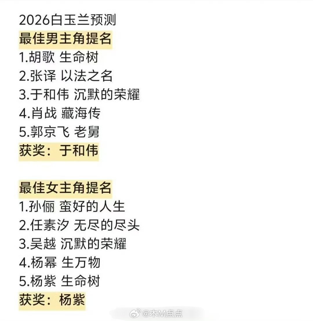 白玉兰官宣6月26日颁奖 网友预测的白玉兰获奖名单最佳男主角:于和伟《沉默的荣耀》最佳女主角:杨紫《生命树》最佳男配角:刘佩琦《老舅》最佳女配角:迟蓬《生万物》