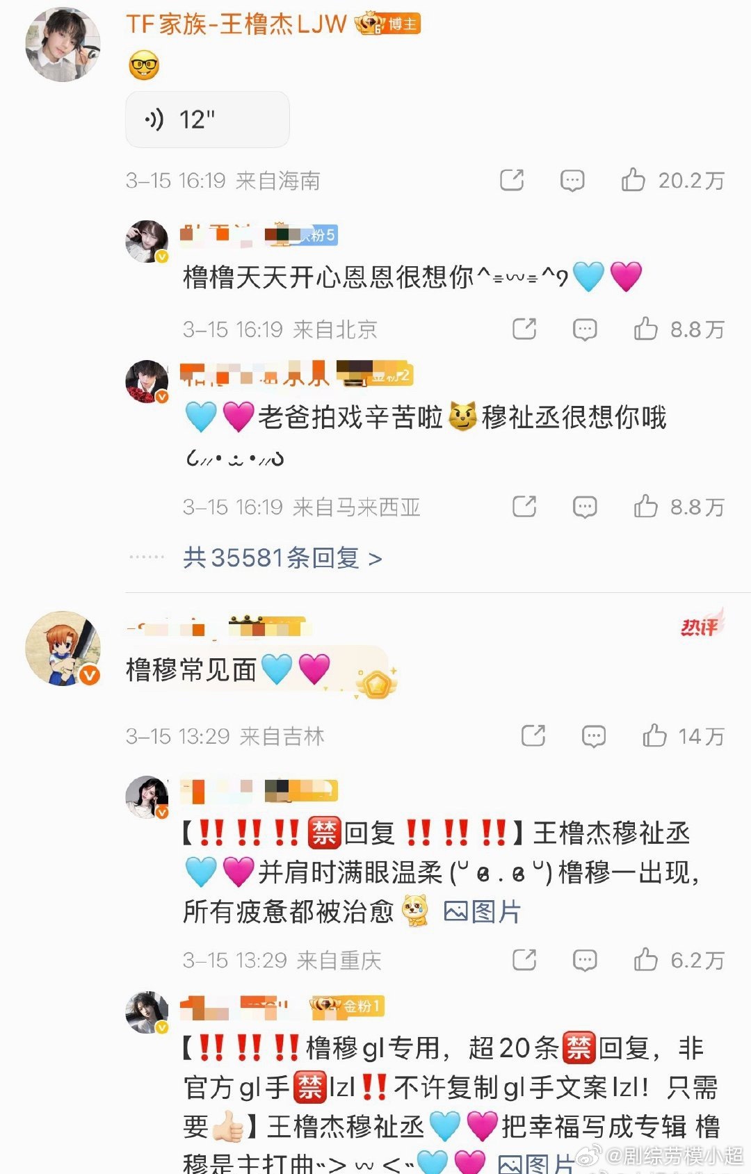 看了下王橹杰微博首页和本人评论回复全是橹穆批,这是楼里cpf最多的一家吧,唯粉比