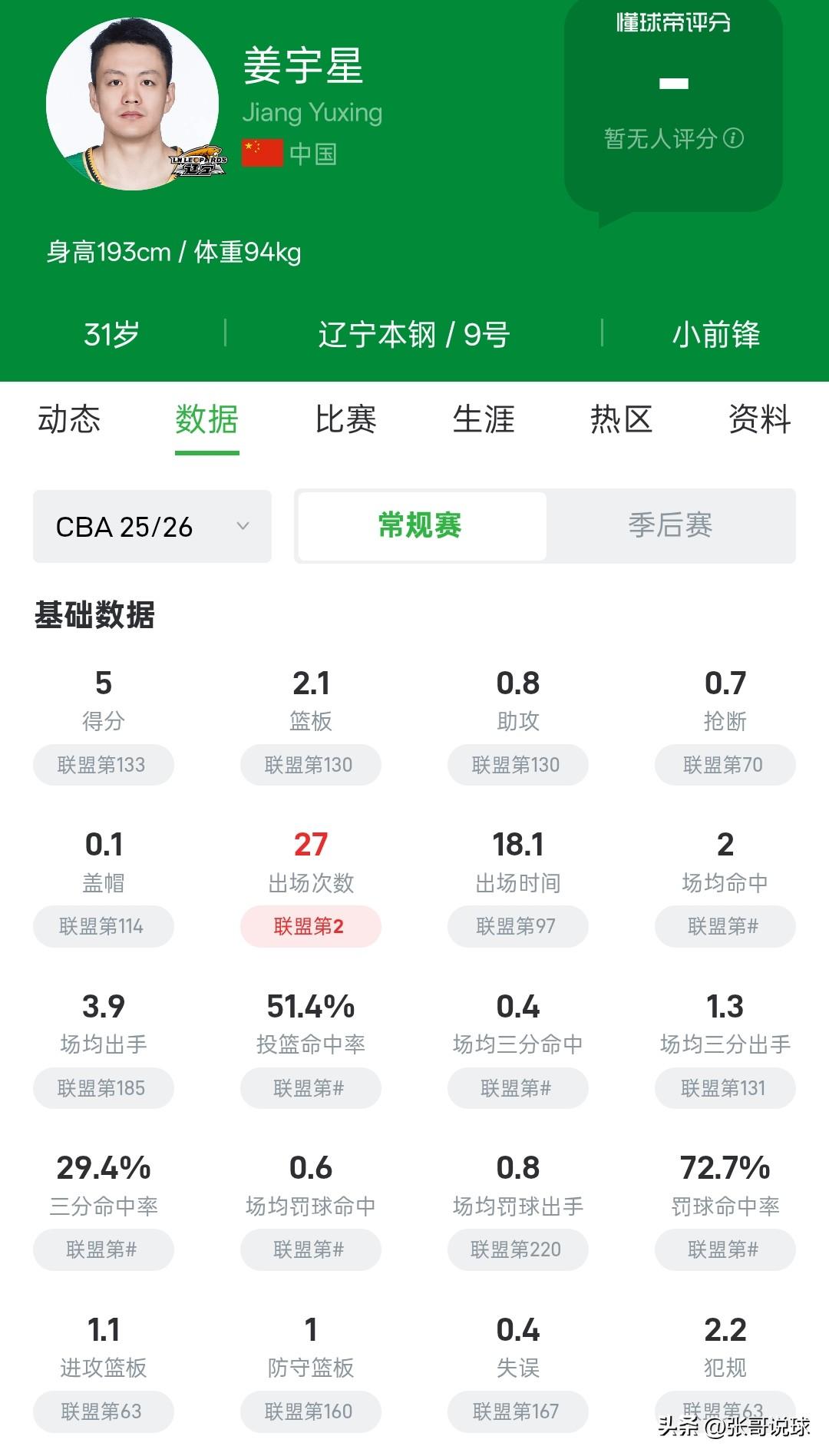姜宇星连轮转阵容都进不去了,姜宇星这个赛季加盟辽宁,赛季开始的时候表现中规中矩,偶尔能投进一个三分,随着联赛深入出手次数越来越少,上场时间越来越少。 辽宁队战胜广东和广州的比赛姜宇星跌出轮转阵容,辽宁队目前是6连胜,姜宇星这个赛季很难再有机会,吴昌泽的处境更差,也是无球可打,这俩人在吉林都风生水起。 姜宇星自进入联盟以来一直得分上双,在吉林队时单赛季场均得分16分左右,本赛季只能拿到5分,吴昌泽数据也断崖式下降。