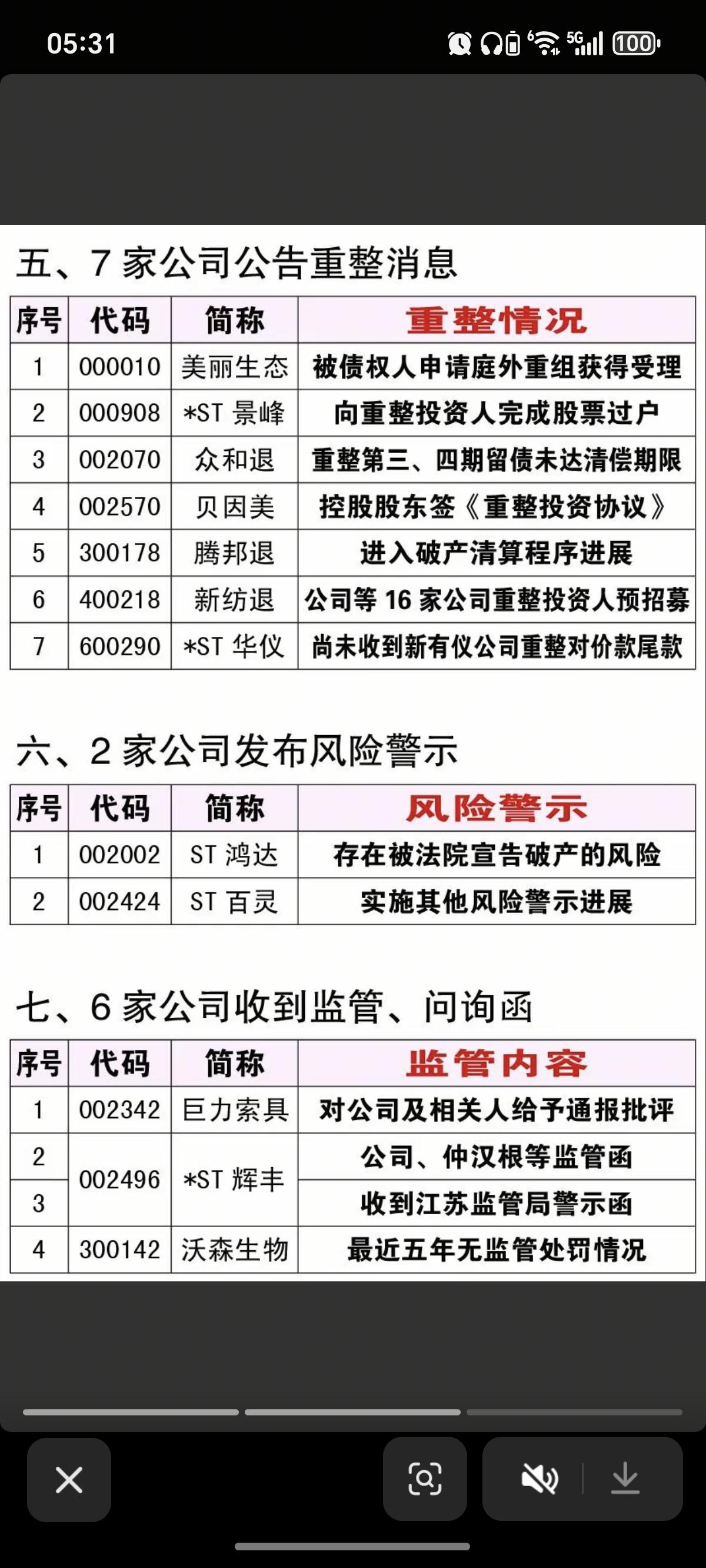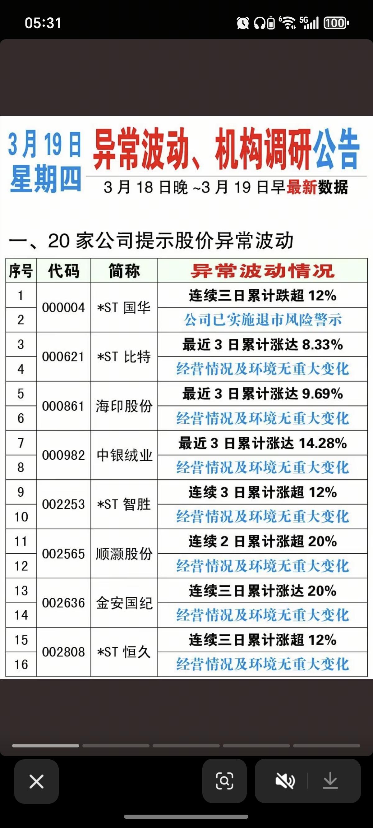 3.19周四 上市公司 利空消息 公告汇总! 主要涉及: 2家公司发布风险警示 7家公司提示终止上市风险 6家公司收到监管问询函 7家公司公告重整消息 20家公司股价异动公告 利空消息股,最好回避