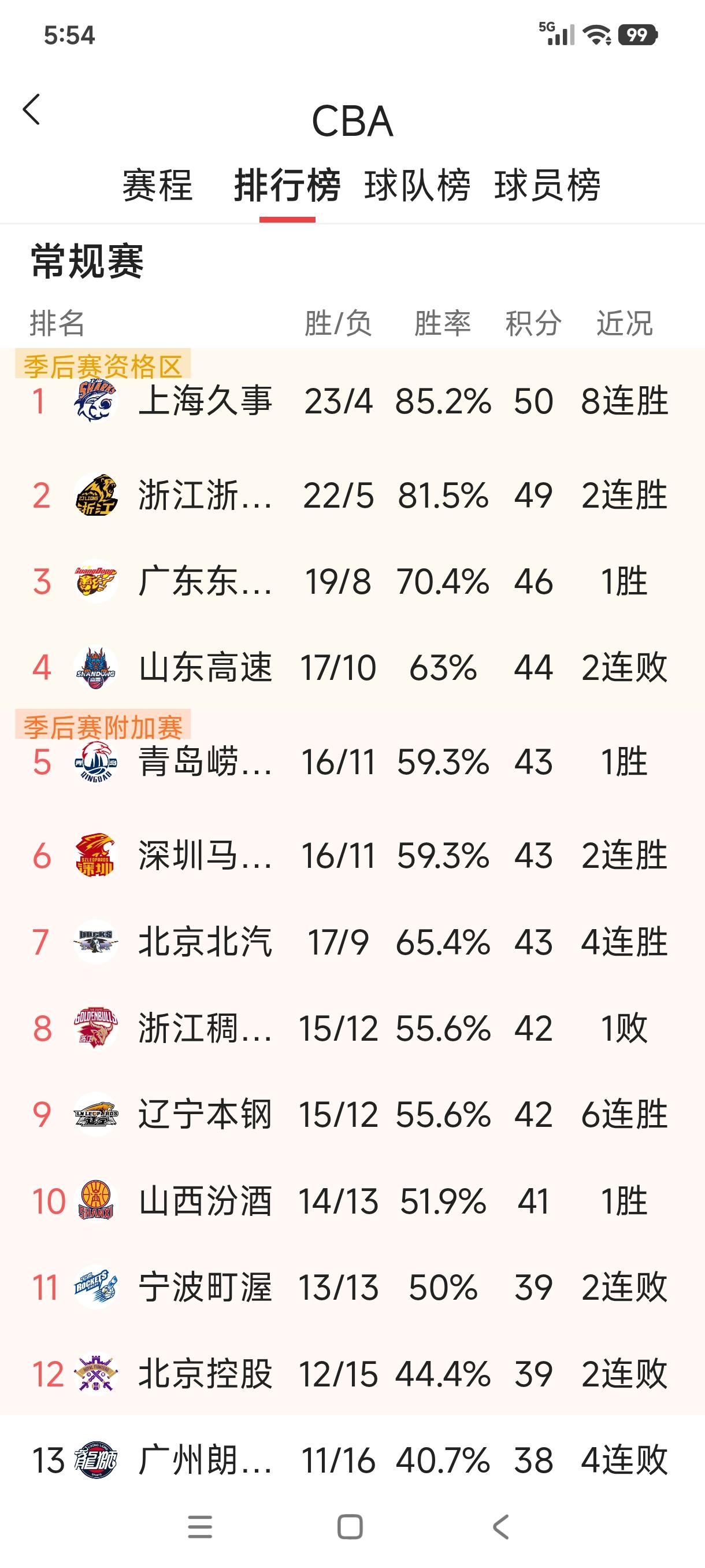 CBA常规赛最新积分榜!已经两连败的山东高速第四名的位置岌岌可危!上海久事112:96大胜山东高速豪取八连胜,稳居榜首。浙江东兴渡、广东东阳光紧随其后。山东高速接连负于浙江稠州金租和上海久事,虽然还排名第四,但领先身后的青岛崂山啤酒、深圳马可波罗、北京北汽仅1分,随时有被反超的危险。如果山东高速常规赛不能保住第四名的位置,季后赛肯定一轮游,拭目以待!