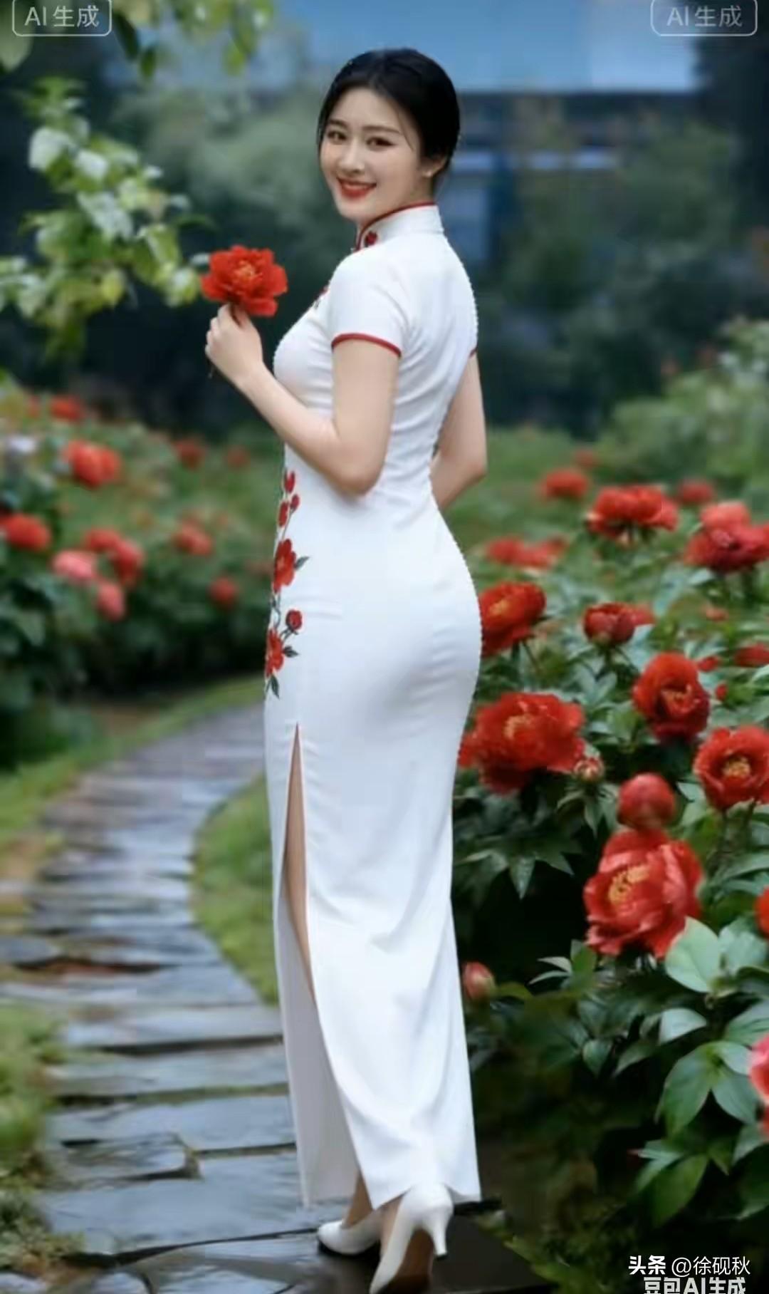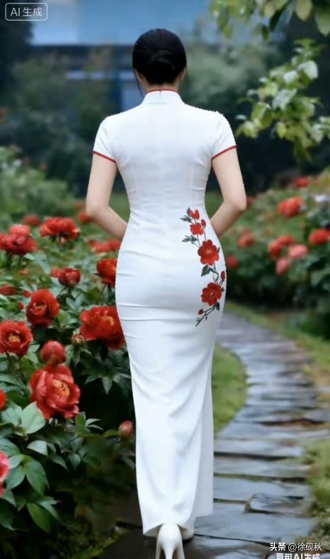 唯有牡丹真国色, 花开时节动京城。 白色旗袍,红色牡丹。 出水芙蓉 ,亭亭玉立。 修身裁剪 ,凸显性感。 高贵典雅,仪态万方。