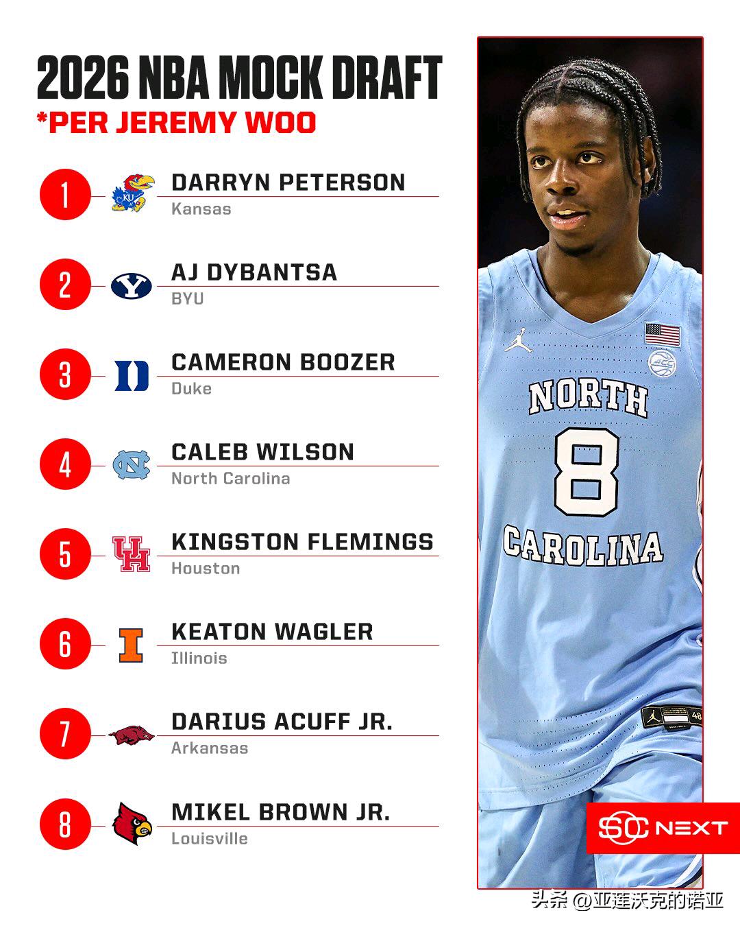 才打了一个赛季,前锋Caleb Wilson的8号将荣誉球衣的标准高挂球馆上空,大一赛季场均得到19.8分9.4篮板入选美联社第二阵容,2026年nba选秀 预测前五顺位,路易维尔控卫Mikel Brown Jr由于背伤将缺席疯狂三月 外界看好红雀首轮就被南佛罗里达大学淘汰。