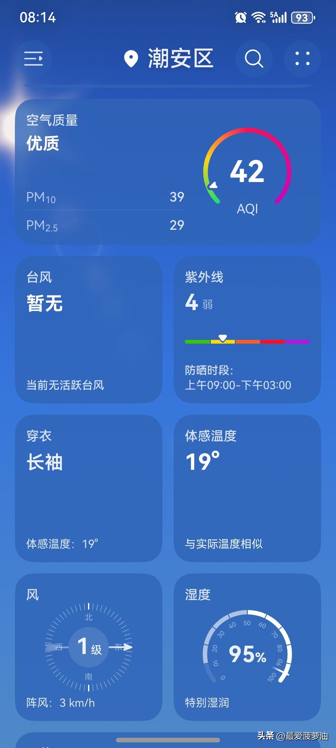弱冷空气在广东摸鱼,19日有弱冷空气逼近南岭! 19~21日,韶关、清远多云到阴天,有小雨或分散小雨,其余市县多云,局部有零星小雨。受云量或降水影响,气温小幅波动。 今天(19日),潮州喜提一个晴天,气温15~26℃,此刻气温19℃,体感温度19℃。 今天的气温依然延续着昨天的温暖,全天最高气温喜提26℃。虽然没有昨天那么热,但早上的温度却比昨天同一时间段要高一点。总之,今天依然是暖暖的,暖到有点离谱了。 一起来看看今天的天空吧!早上太阳依然上线营业,挺意外的!原以为今天是阴天呢!万万没想到啊!早上起来发现,太阳当空照,阳光甚好! 不过天空云量大增,还有点雾气,阳光显得没有那么明媚。 从整体看来,今天的天气依然值得拥有一个五星好评! 如此天气!元芳,你怎么看? [捂脸][我想静静][大笑][笑哭][捂脸][我想静静][大笑][笑哭]