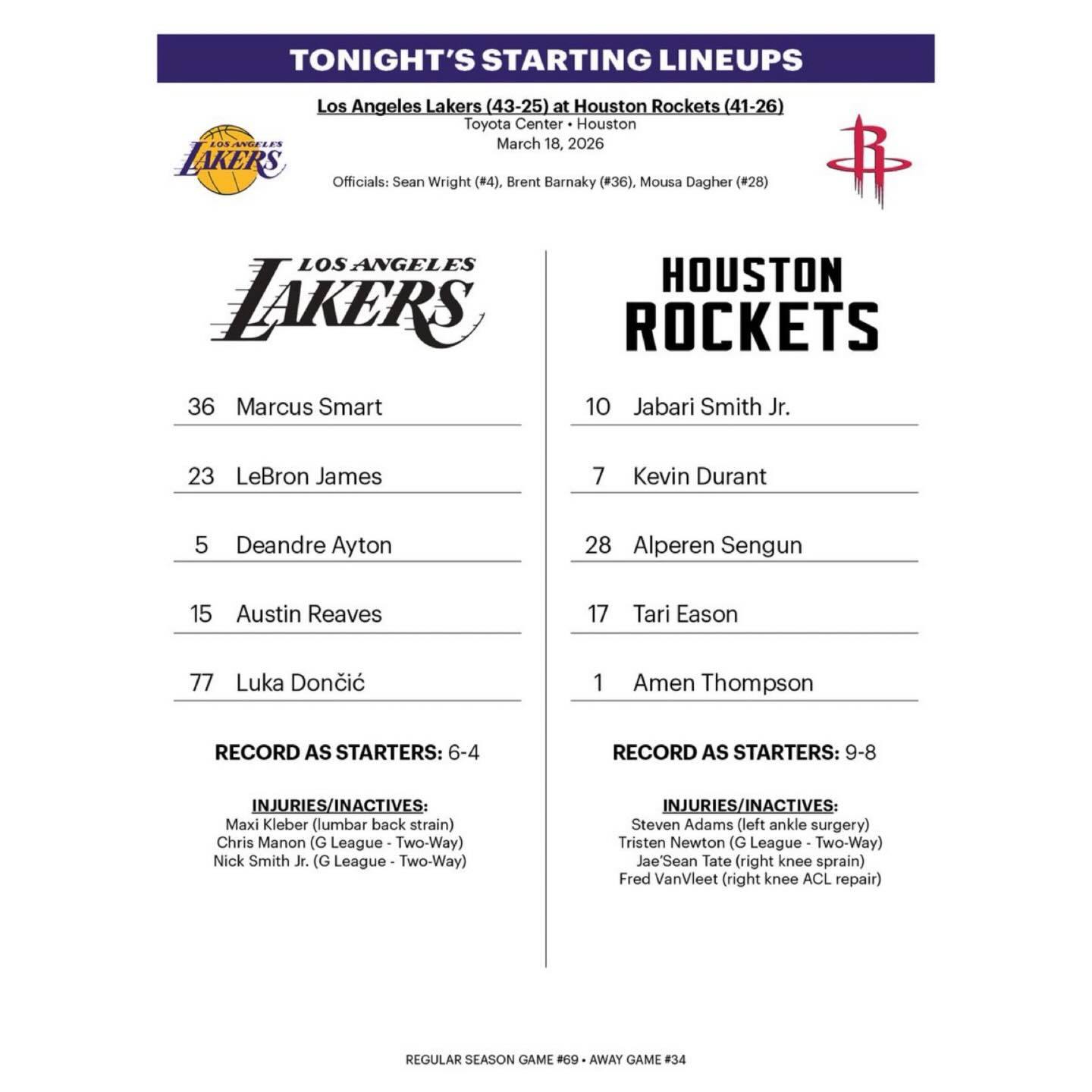 首发不变:东契奇、斯玛特、里夫斯、老詹、艾顿!湖人vs火箭