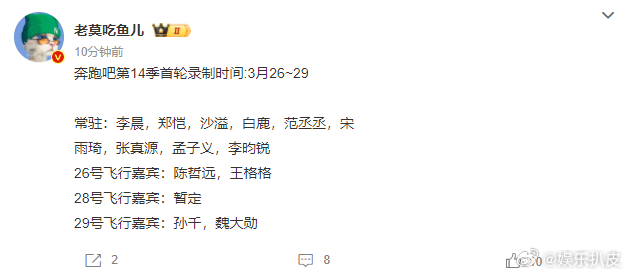 奔跑吧14首轮录制阵容奔跑吧14常驻嘉宾阵容《奔跑吧14》首轮录制阵容!李晨,郑恺,沙溢,白鹿,范丞丞,宋雨琦,张真源,孟子义,李昀锐;期待!