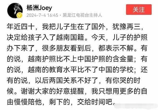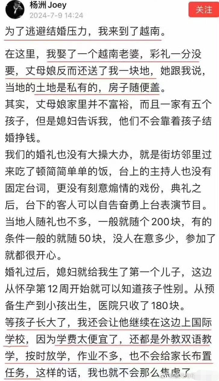 黑龙江电视台的主持人杨洲说把孩子入了越南国籍,好多女权表示不理解,开始咒骂他。 结果他说,因为他的经济条件,在国内是没资格结婚的,他就去了越南,他老婆是越南人,越南娶媳妇没彩礼。 他85年的,他的越南太太98年的 年龄就差了十三岁 而且越南丈母娘还送他一块土地,可以随便盖豪宅,然后破防的女权就更多了……