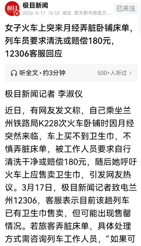 甘肃兰州,一女子坐火车卧铺,因经期不规律,突然来月经,她没带卫生巾,火车上又买不到,大半夜的,又不好意思跟其他睡着的旅客求助,就把衣服垫在屁股下面,可还是弄脏了床单,列车员要求她要么赔180元,要么洗干净,女子赔不起,就只能尴尬的去洗,洗完后怕再弄脏,她一直站到下车。女子气愤的是:列车上会配售热水、零食和卫生纸,而卫生巾同样是女乘客的刚需,为什么没有售卖? 说实话,出门在外,谁都有不方便的时候。 尤其是这种事,赶上了就特别尴尬,周围都是陌生人,连个应急的东西都没有,那种无助感真的很难受。 女乘客也特别小心,一直尽量保持一个姿势不动,就怕出意外。 可越紧张越容易出问题,最后还是没忍住,把身下的床单给弄脏了。 跟那些故意损坏公共物品的人不一样,这个女乘客从始至终都特别愧疚。 她也知道,这床单是给下一个乘客用的,也明白列车工作人员要负责清洗卧具,所以她也没逃避,一直等着列车员过来,想好好商量一下怎么处理。 只是,当听到列车员的回复后,她的心情还是有些低落的。 这180块钱,确实超出她的预期太多了。 而且这事也不是她故意弄的,是生理原因,自己也控制不了,再加上火车上买不到卫生巾,才间接弄成这样的。 更无奈的是,她身上也没带那么多现金,没法当场交钱,最后没办法,只能硬着头皮,去洗漱台亲手洗床单。 可能很多人不知道,火车卧铺的床单,大多都是100%全棉的,这种床单睡着舒服、透气,适合长途坐车的时候睡,但清洗起来是真麻烦。 尤其是经血这种顽固污渍,光靠手洗,根本很难洗干净。 女乘客在洗漱台洗了好长时间,手上全是污渍,费了九牛二虎之力,才勉强把床单洗干净。 洗完之后,新的麻烦又来了,她怕自己再坐上去,又把刚洗好的床单弄脏,也怕渗漏的情况再发生,只能全程站在车厢里,一直等到火车到站。 整整好几个小时,她连口气都没歇,水都没顾上喝一口,身体和心里都特别累。 有网友十分心疼女乘客,毕竟月经这种事,也不是谁能说得准的。 也有网友建议,女生出门的时候,不管是不是经期,都应该随身携带卫生巾。 随着讨论的愈演愈烈,官方也出来解释。 旅客要是不小心弄脏了火车上的卧具,具体怎么处理,是由列车上的工作人员当场判断的,没有统一的固定标准。 至于这次的180块钱赔偿,客服也没说这是统一标准,也没否认列车员当时的做法,反复强调“工作人员会严格按照内部规定来处理”。 女乘客弄脏的床单,就算当时没法用手洗干净,后续送到洗涤车间,经过专业处理,还是能正常用的,根本没到“必须报废”的程度。 所以列车员的方案,确实有点不太合理,也不够人性化。 对于这件事,您有什么想说的吗?欢迎评论区留言讨论。 信息来源: 极目新闻 2026-3-17 女子火车上突来月经弄脏卧铺床单,列车员要求清洗或赔偿180元,12306客服回应