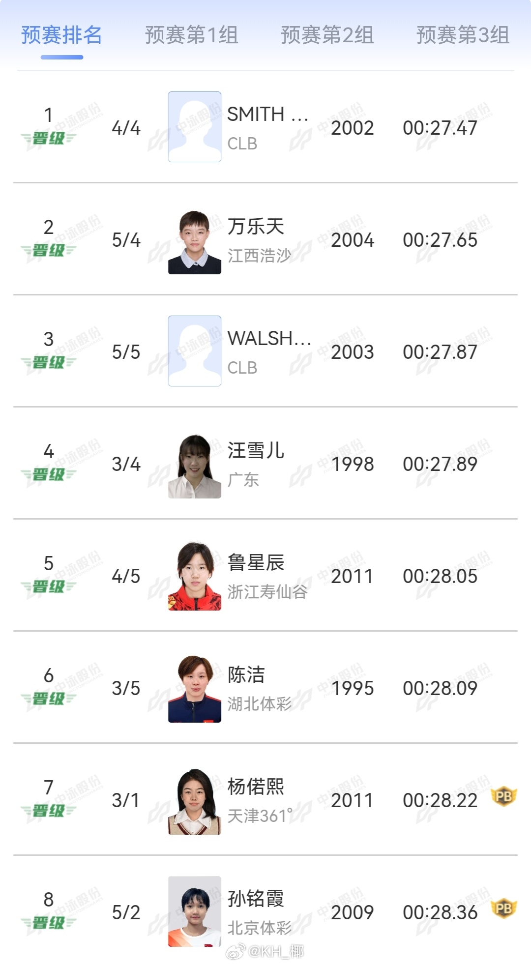 2026年中国游泳公开赛 女50仰预赛小刷子 27.47万乐天 27.65小沃 27.87 PB汪雪儿 27.89 鲁星辰 28.05陈洁 28.09杨偌熙 28.22 PB孙铭霞 28.36 PB余依婷 28.43 PB彭旭玮 28.45 李佳蔚 28.54陈欣 28.79罗悠扬 28.79李宛蔚 28.91付钰喧 28.91陈晓君 28.92