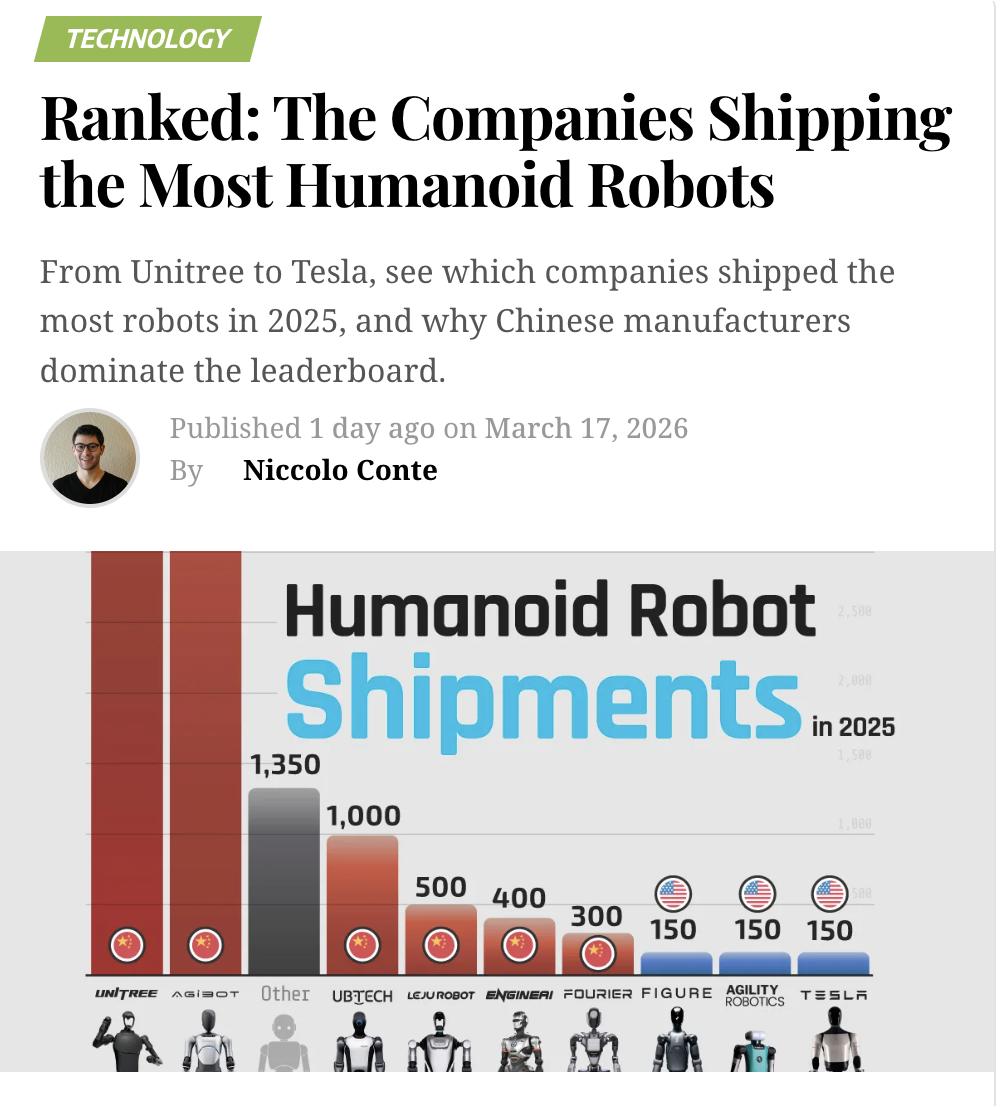 外媒:2025年人形机器人出货量排名,中国占据九成,美国远远落后 2025年全球人形机器人出货量突破14,500台,中国企业占据约90%的市场份额,主导地位压倒性。 各公司出货量排名如下:宇树科技(中国)5,500台居首,较上年约1,500台大幅增长,最低款R1售价仅5,900美元,机器狗售价1,600美元;亿博智能(中国)5,168台紧随其后,最低款售价14,500美元;优必选(中国)1,000台;乐聚机器人(中国)500台;Engine AI(中国)400台;傅利叶智能(中国)300台。 美国三家企业——Figure AI、Agility Robotics、特斯拉各约150台,特斯拉Optimus预计2027年才开放公开销售。值得一提的是,Figure AI估值已从2024年的26亿美元飙升至390亿美元。 中国优势背后是深厚的供应链体系。长三角拥有全球最完整的人形机器人垂直整合产业链,中国掌控全球约26%的执行器市场(美国仅5%),以及约60%的关键矿产和稀土生产。2025年中国共推出21款新型号,而2022年仅有3款。