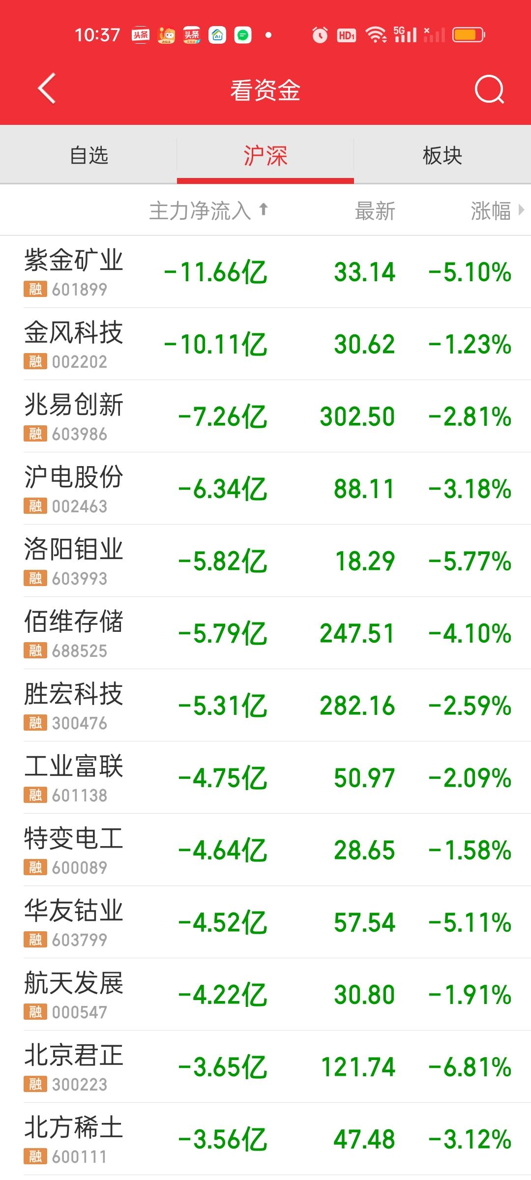 今天两市加起来有接近4700家个股下跌,整个市场一片哀嚎。成交量尽管放量了不少,但大盘净流出的资金同样也不少。距离我们一周之前划的第二道防线越来越近了。这也意味着可能马上就会到一个胜率比较高的加仓点位了。第一道防线到了以后确实迎来了反弹,但反弹的力度有限。 主力资金资金流入方面,今天没有净流入资金超过10亿的个股,主力资金净流出方面,紫金矿业,金风科技净流出资金在10亿以上。