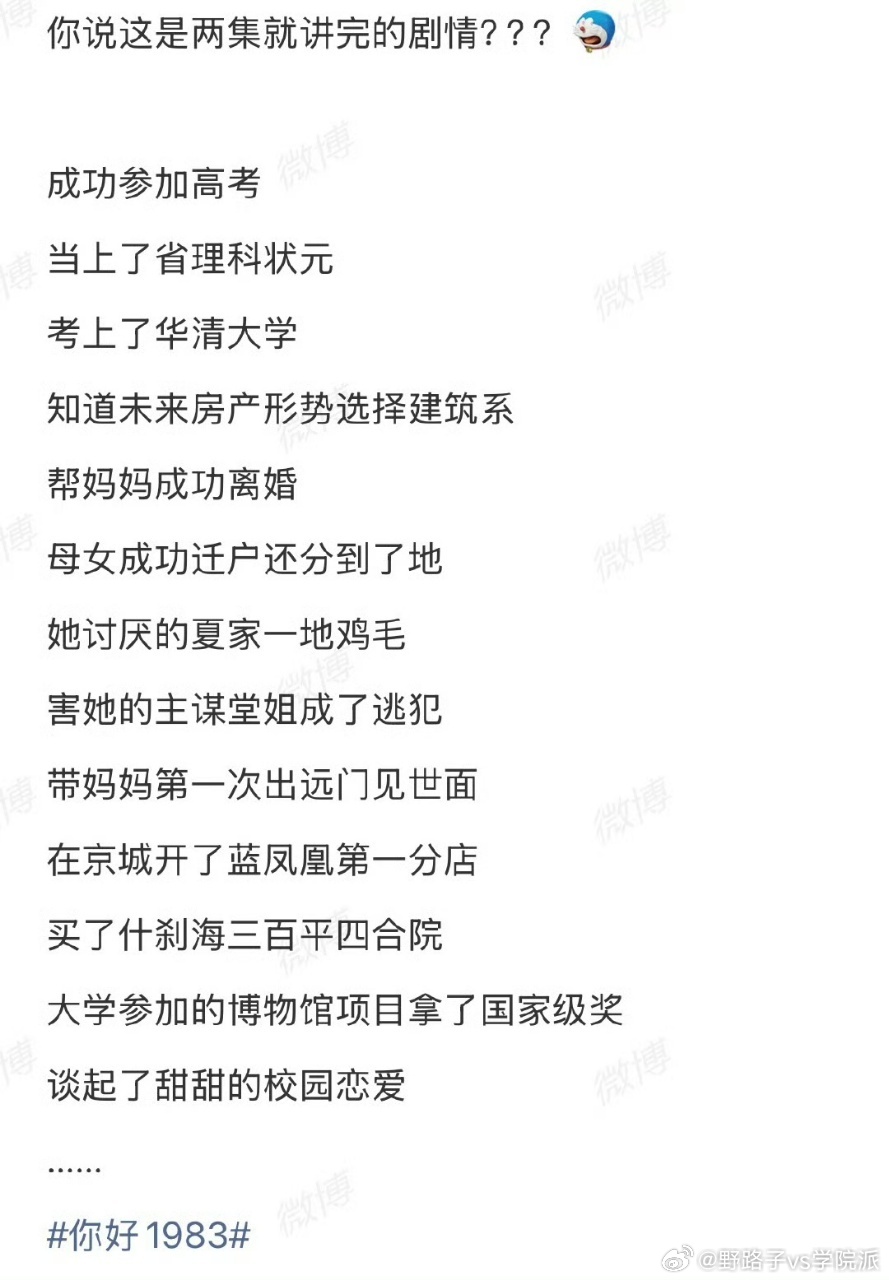 你好1983剧情节奏好快你好1983我贪了 《你好1983》的剧情节奏太惊艳,全程无尿点、不注水,没有多余拖沓情节,漏看一秒都得重刷,两集就完成别人二三十集的剧情。夏晓兰一路开挂搞事业,怼极品、拼高考、闯事业,越看越上头,实在太贪,根本满足不了。