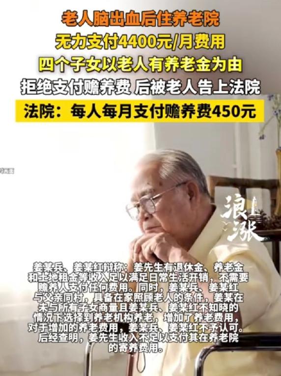 养了一群白眼狼!江苏,老人脑出血出院后,生活无法自理,每天连口热乎饭都吃不上,无奈之下,老两口选择住进养老院,可是,养老院每月要4400元,他的退休工资根本不够,没办法,便跟四个子女开口,希望他们能承担这笔钱,谁知,竟遭到拒绝,老人心寒极了,我养他们小,他们却各个像个白眼狼,于是,他一气之下把四个孩子告上法庭,法院判了。 这位老人今年八十多岁,家在江苏当地,前段时间突发脑出血,万幸的是抢救及时捡回了一条命,但出院后彻底失去了自理能力,老伴年纪也大了,身体也不算好,根本没法长期照顾他,每天忙前忙后,连顿热乎饭都没法按时吃。 实在没办法,老两口商量来商量去,只能选择住进养老院,打听来打听去,找了一家条件还不错,能照顾失能老人的养老院,可一问费用,每月要4400块钱,老人有退休工资,但数额不多,根本不够支付这笔养老院费用,还差一大截。 这时候,老人第一个想到的就是自己的四个子女,老人拨通了四个子女的电话,跟他们说明情况,希望四个孩子能分摊一下每月的养老院费用,每人出一点,凑够这4400块钱,让自己能安安稳稳度过晚年。 可让老人万万没想到的是,四个子女没有一个愿意答应,有的说自己家里经济紧张,压力大,没多余的钱,有的说老人有退休工资,应该自己承担,还有的干脆找借口推脱,说工作忙,没时间管这些事,到最后,没一个人愿意伸把手。 老人拿着电话,听着子女们一句句冷漠的推脱,心彻底凉透了,他跟老伴说,自己一辈子勤勤恳恳,省吃俭用,把四个孩子一个个拉扯大,供他们读书成家,从来没让他们受过一点委屈,可现在自己老了病了,连口热乎饭都吃不上。 想让他们分担点养老费用,却比登天还难,这跟养了一群白眼狼有什么区别?心寒到了极点,老人也没了别的办法,只能拿起法律武器,一气之下把四个子女都告上了法庭。 他不想逼孩子们,可实在是走投无路,他只是想求一个公平,求一个能安度晚年的保障,法院开庭审理了这起案件,结合老人的实际情况、子女的经济条件以及相关法律规定,最终做出了判决。 四个子女必须履行赡养义务,平均分摊老人每月的养老院费用,除此之外,还要定期探望老人,关心老人的生活和身体状况,其实说句实在的,老人要的从来不是多少钱,而是子女的一份心意和担当。 小时候,父母把我们捧在手心,不管多苦多累都不会抛弃我们;可当父母老了、病了,我们却找各种借口推脱,这良心上能过得去吗? 赡养父母不是选择题,而是每个人的法定义务,更是刻在骨子里的道德底线,希望这四个子女能明白老人的苦心,也希望所有为人子女的,都能多体谅一下父母,别等失去了才懂得珍惜,别让父母寒了心。