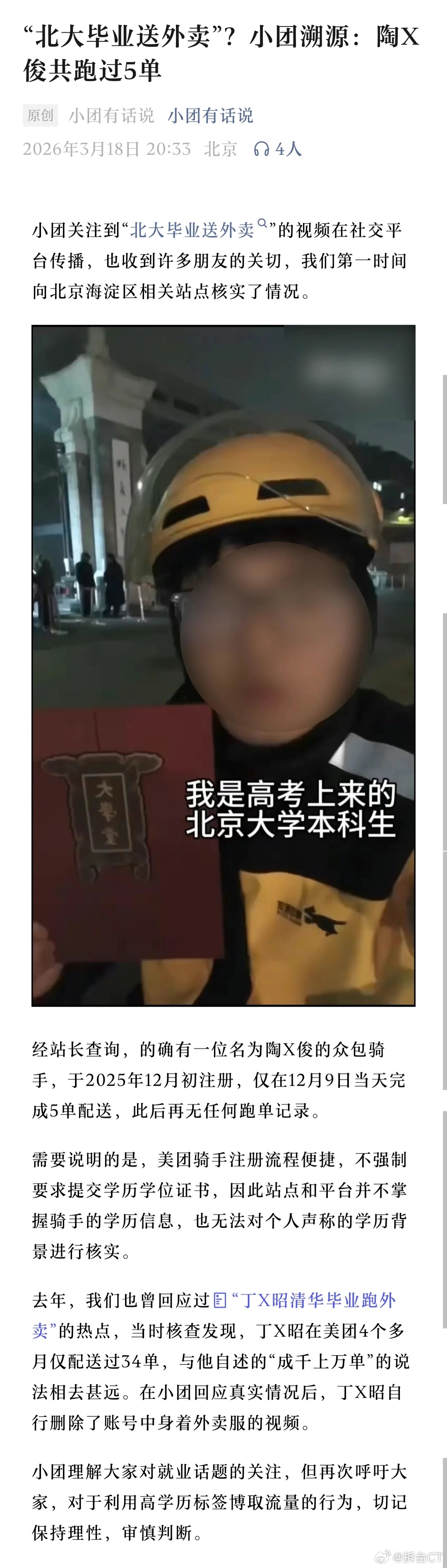 不管是现在的北大毕业送外卖,还是现在的清华毕业送外卖。