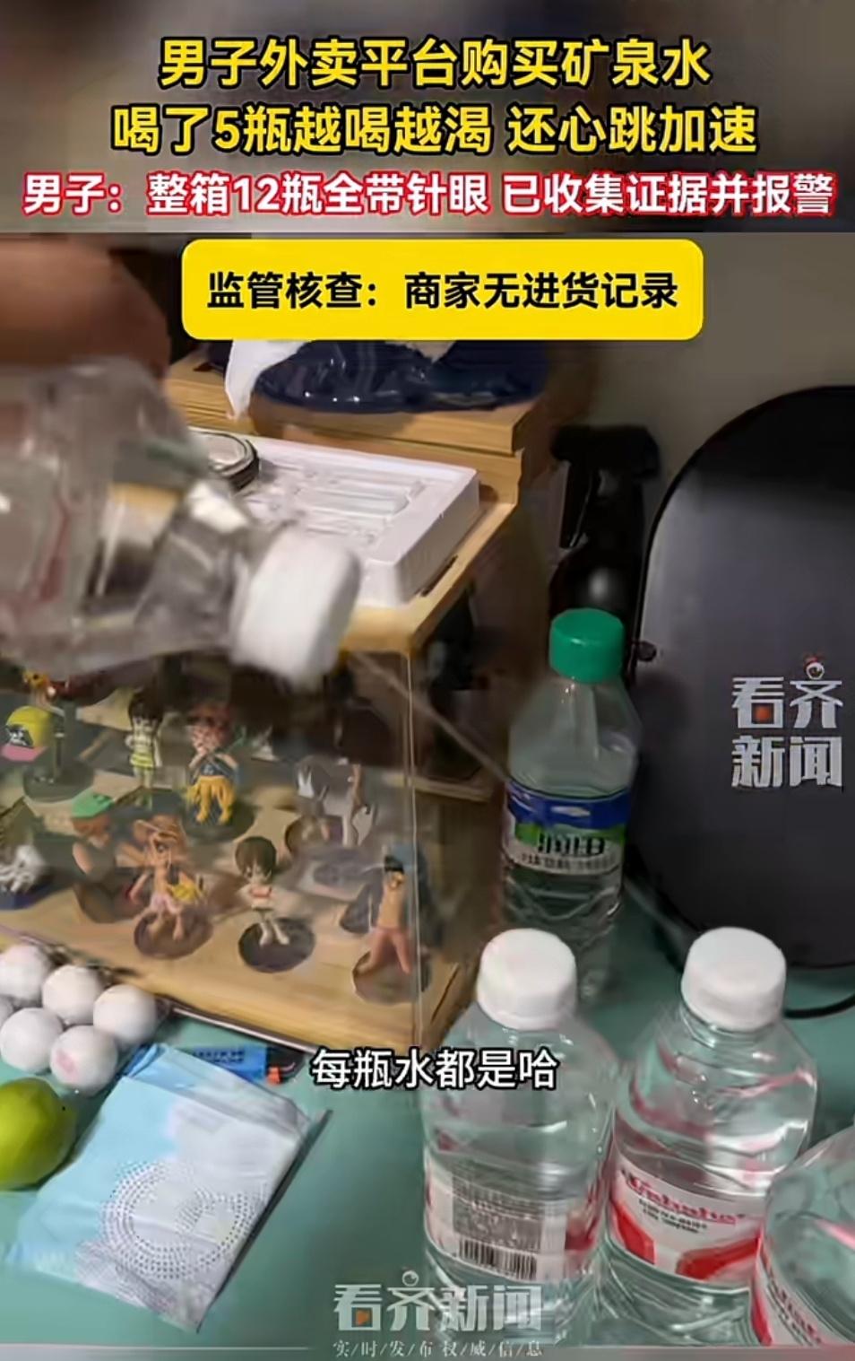 男子在外卖平台下单一箱矿泉水,喝了5瓶后,不仅没解渴,反而越喝越渴,还出现心跳加速、身体不适的症状。 检查剩下的瓶装水发现,整箱12瓶矿泉水,瓶身全都有细小针眼,明显是被人恶意扎破过。目前男子已收集好证据报警,监管部门核查后发现,涉事商家根本没有任何进货记录,货源成谜。 外卖水 针眼矿泉水 大家在外卖或超市购买瓶装水时,一定要注意检查瓶身是否有破损、针眼、渗漏,瓶盖是否有被拧开的痕迹。如果喝后出现莫名不适,立刻停止饮用并就医,同时保留证据维权!