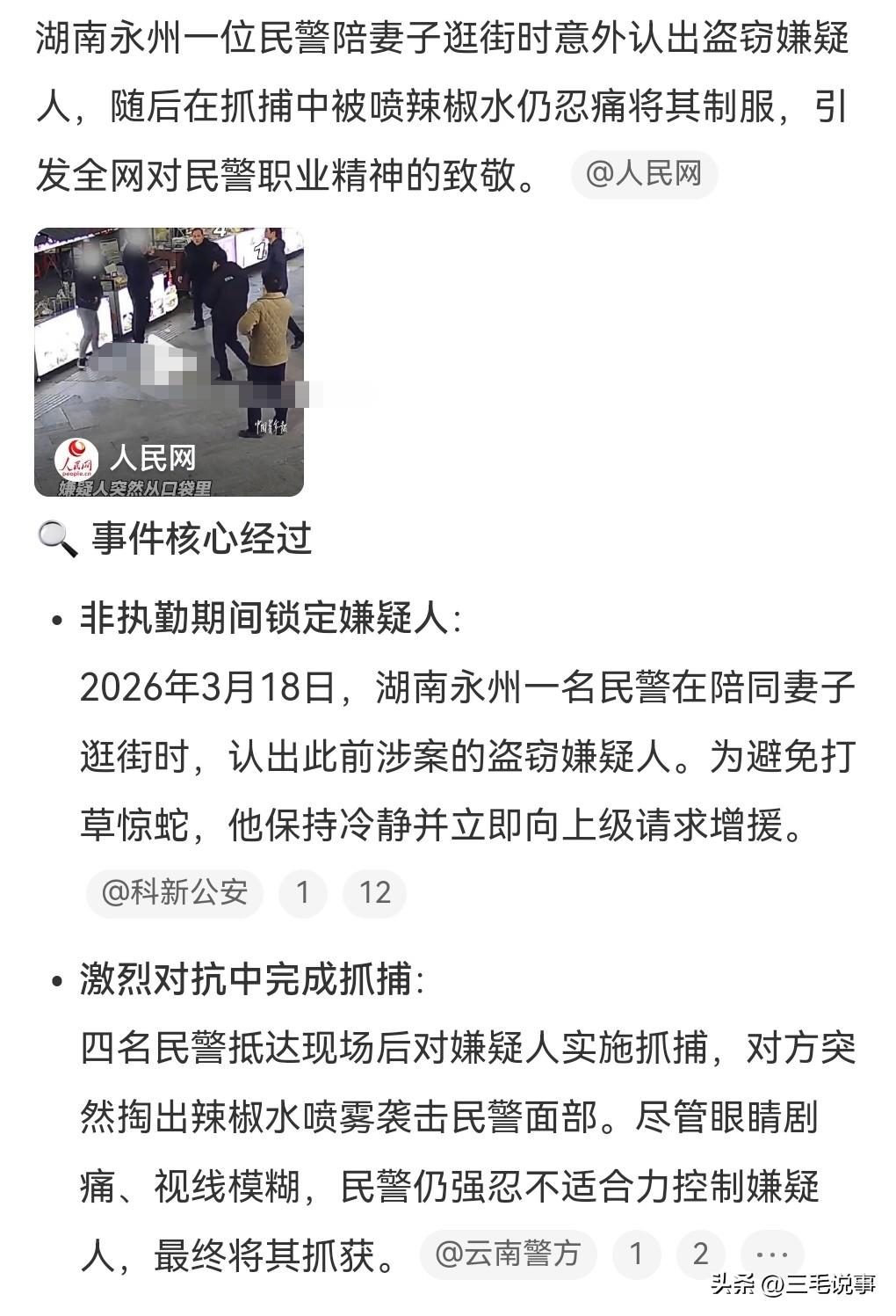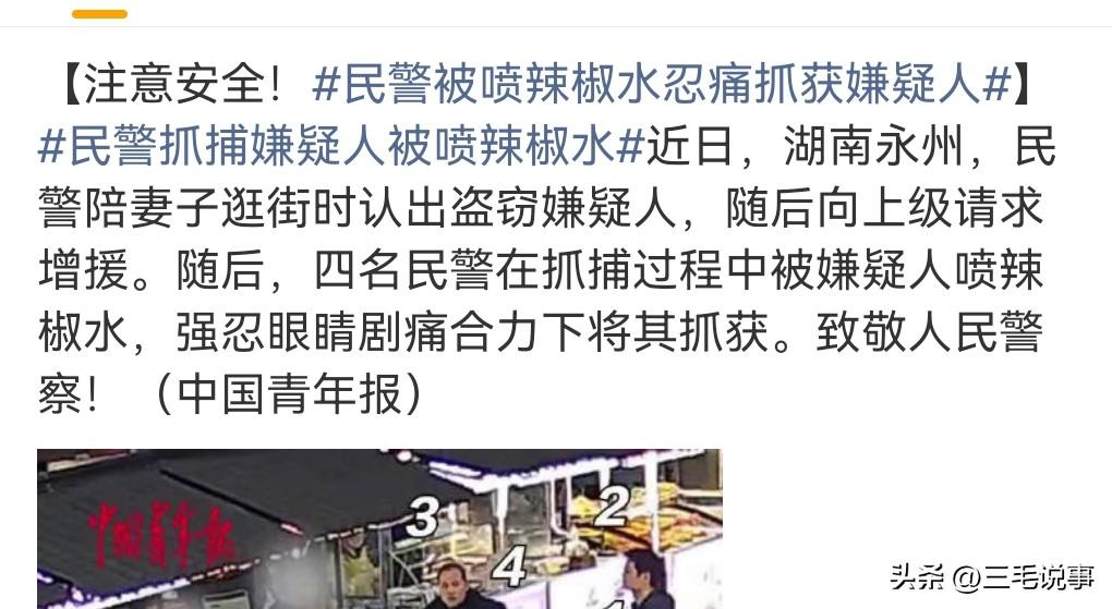 小偷实在是太可恶了,把别人的财务给偷走,令别人造成损失,有时候甚至是重大的损失,小偷实在是太可恨了。 近日湖南永州,民警陪妻子逛街时认出盗窃嫌疑人。民警在认人这一方面真的很厉害一眼就能够认出是否是嫌疑人,这也源于他们的职业敏感度,必须要牢记犯罪分子的长相。 当时民警肯定是在休息,在陪妻子逛街,认出了嫌疑人,于是就向上级请求增援。4名民警在抓捕过程中被犯罪嫌疑人喷辣椒水。想不到犯罪嫌疑人还随身携带辣椒水,这真是有备而来呀。被喷辣椒水的民警忍着剧痛,合力抓住小偷。 民警们也要保护好自身的安全,做好防范。 小偷竟然还敢拒捕,而且还袭警,这真是罪加一等,必须要好好的惩罚一下。想不到小偷携带辣椒水,这真是太狡猾了。