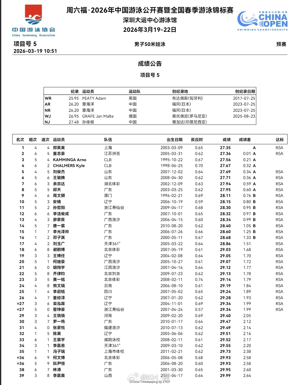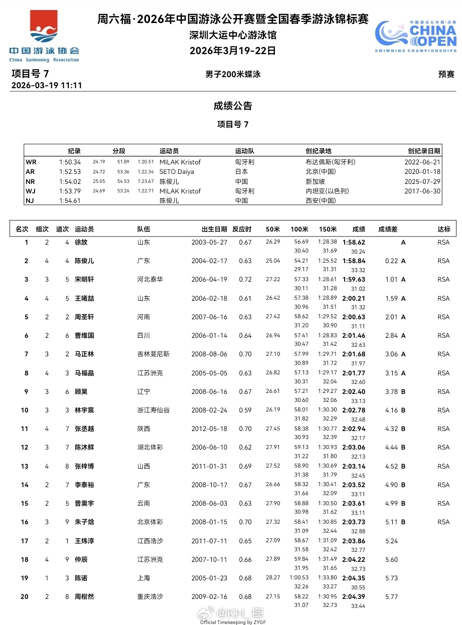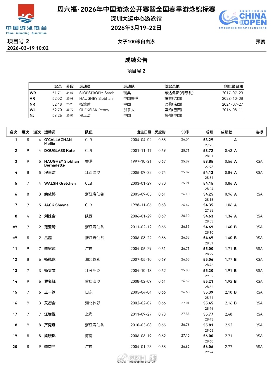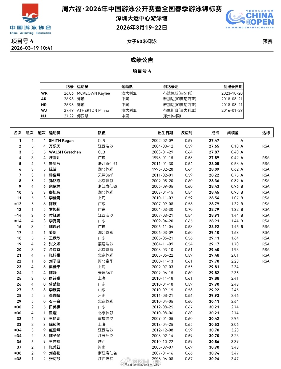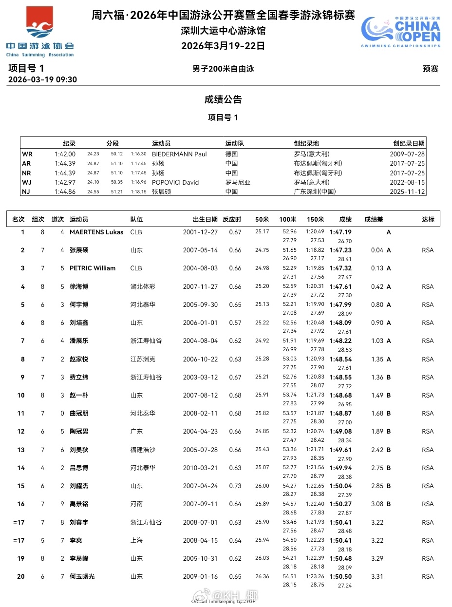 2026年中国游泳公开赛 第一天预赛成绩公告
