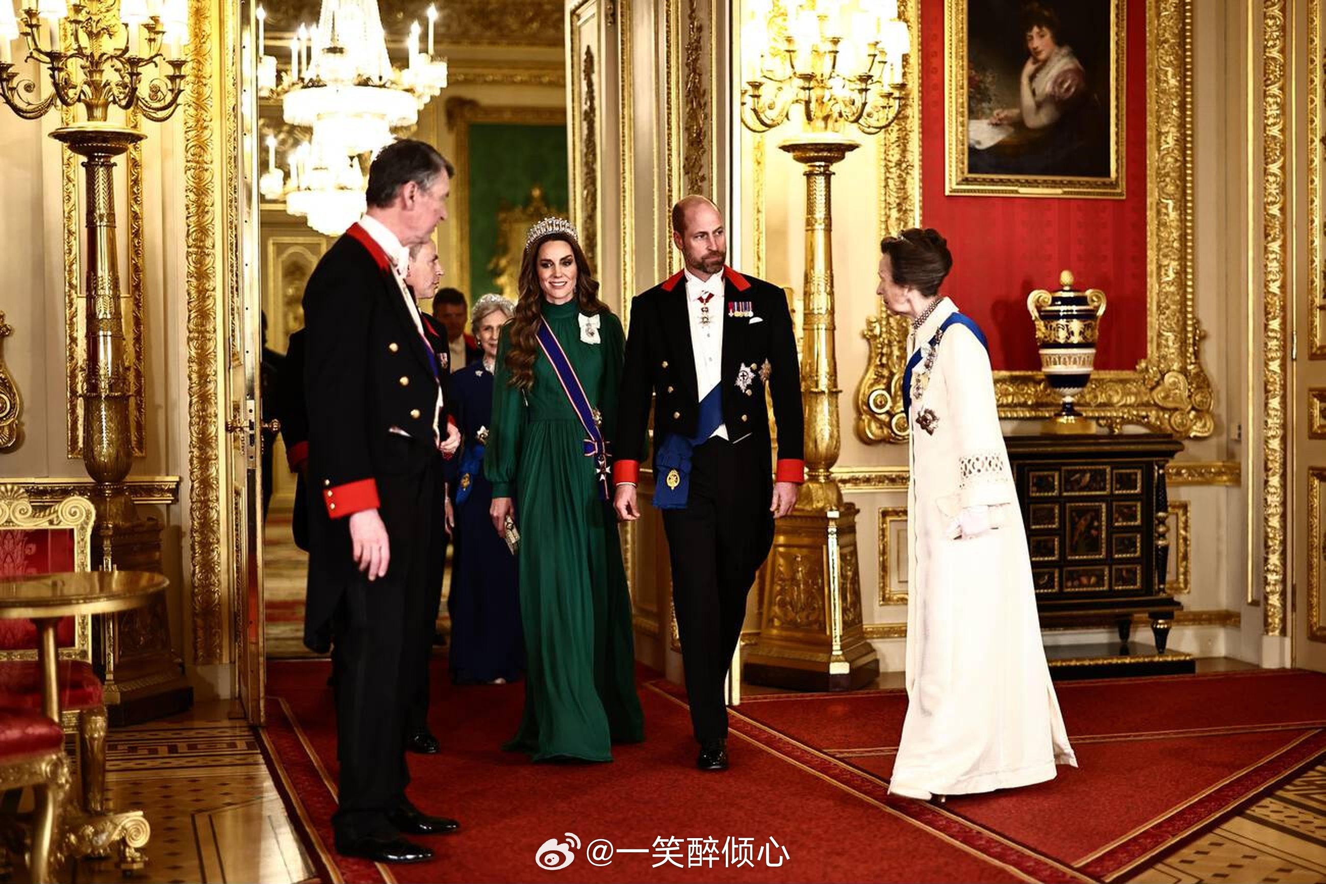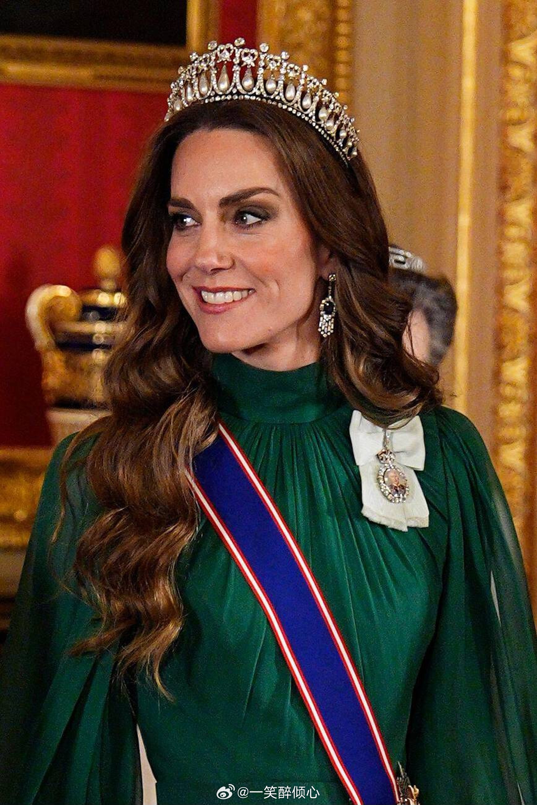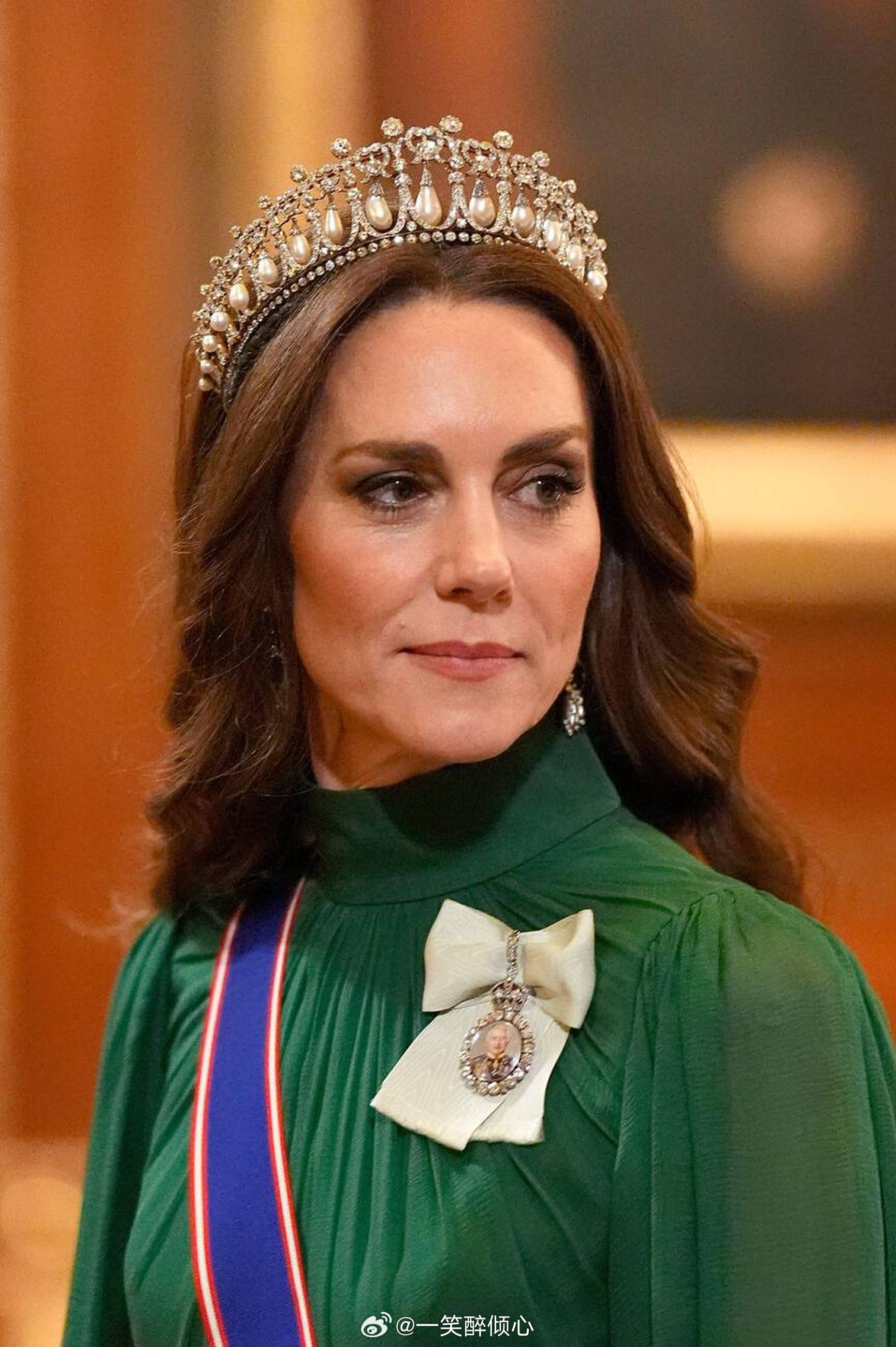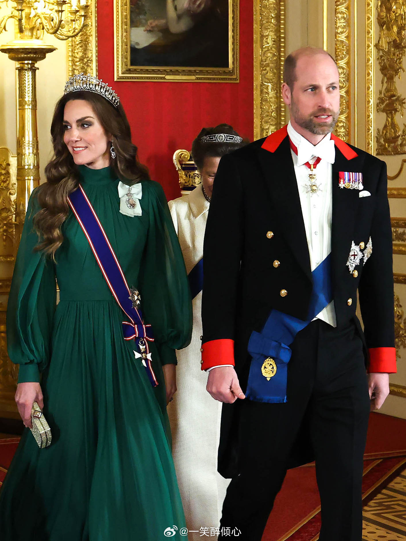 2026年3月18日,威尔士亲王夫妇在温莎城堡参加尼日利亚国宴🇳🇬晚礼服是Andrew GN,高跟鞋是Manolo Blahnik,手包是Jenny Packham,王冠是著名的珍珠泪,耳环是伊丽莎白王太后的钻石蓝宝石流苏耳环,勋章是查尔斯三世家族勋章(看来这位姐真是铁定主意再也不戴2️⃣枚家族勋章),绶带是爵级皇家维多利亚大十字勋章。