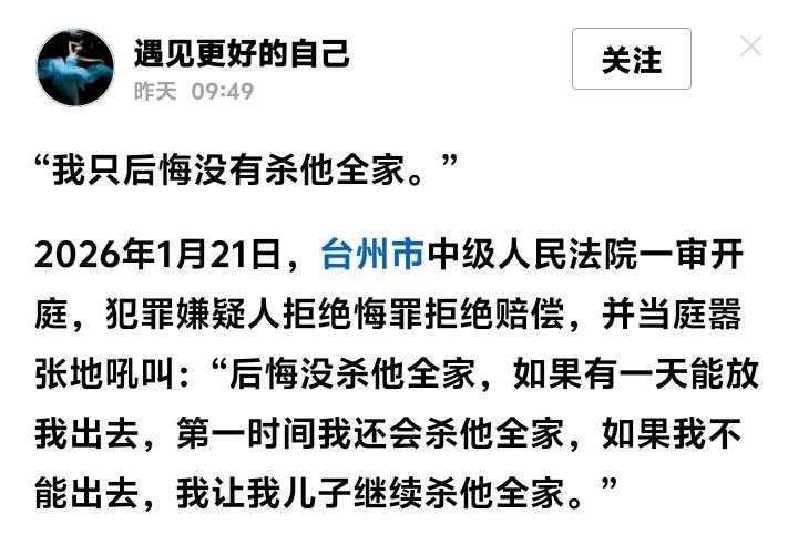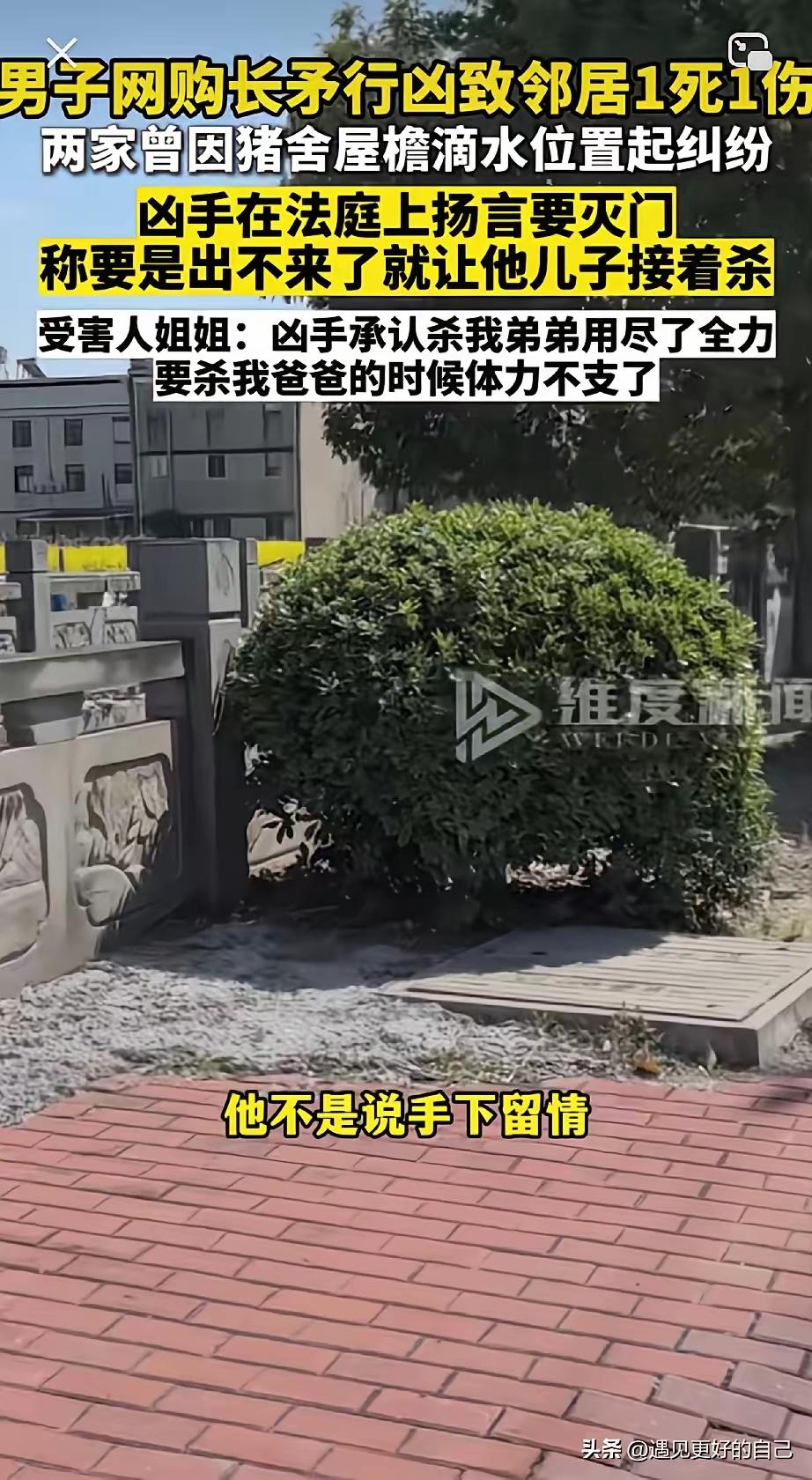 浙江天台猪圈血案:一滴屋檐水引爆灭门惨剧,凶手法庭狂言“让儿子继续杀全家”背后的人性深渊 当法庭上响起“我只后悔没有杀他全家”的咆哮,整个互联网都被这声来自地狱的嘶吼震得发颤。2026年台州中级人民法院的庭审现场,犯罪嫌疑人陈某豪的嚣张,撕开了农村邻里纠纷中最血腥的一页。这不是电影台词,而是一个真实凶手对生命彻底的蔑视。 仅仅因为猪圈屋檐滴水越界,一场争执竟埋下灭门的祸根。2024年5月,陈某豪翻修猪圈时与邻居陈某周家冲突,推伤对方母亲后赔偿三千元,心中却燃起滔天恨意。谁能想到,一滴屋檐水,会演变成一条人命和两个家庭的毁灭? 仇恨的种子在四个月里疯长。陈某豪网购长矛,日夜蹲守,像野兽等待猎物。2025年5月11日黄昏,他终于在陈某周下班路上挥出凶器,随后冲进邻家追杀其父母。若非两位老人拼死反抗,灭门惨案已成现实。更可怕的是,他逃亡后服毒未遂报警,竟称“没力气了,不然绝不放过”。 法庭上,他毫无悔意,扬言若出狱必再行凶,甚至要儿子“继承”杀戮。这种代际传递的仇恨,让人脊背发凉。农村宅基地纠纷频发,但如此极端案例仍敲响警钟:当理性被偏执吞噬,小事就成了点燃人性恶火的引线。 血案背后,是农村社会长期隐痛。土地纠纷、面子文化、调解机制缺失,让矛盾如野草般滋生。陈某豪的疯狂,不仅源于个人戾气,更映射出基层矛盾化解的乏力。若当初有一道有效的干预屏障,悲剧或许能被扼杀在萌芽里。 我们震惊于凶手的冷血,更痛心于生命的廉价。一条命、两个家庭、三代阴影,换来的只是法律严惩和社会叹息。此案警示我们:任何纠纷都不值得用鲜血祭奠,任何仇恨都不该以毁灭为终点。 和谐社会需要每个人守住底线。遇事冷静一分,退让一步,或许就能避免万丈深渊。天台这滴染血的屋檐水,应当浇醒所有人:勿让情绪魔鬼,操纵你的人生。 (来源:遇见更好的自已、根据台州市中级人民法院庭审记录及浙江天台县警方通报综合撰写) 邻里悲剧 人性反思
