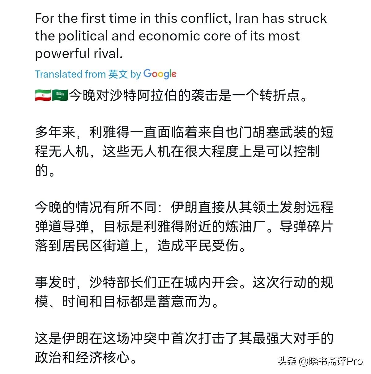 重大升级!伊朗打击沙特的炼油厂了!3月19日,根据外媒报道,外媒称,伊朗直接从本国领土发射了远程弹道导弹,打击了沙特首都利雅得附近的炼油厂。多年来,利雅得面临着来自也门的短程、基本上可以管控的胡塞无人机的攻击,而这次弹道导弹从伊朗发射,这对沙特阿拉伯的袭击是一个转折点。 事实上,伊朗袭击时,包括阿塞拜疆、巴林、埃及、约旦、科威特、黎巴嫩、巴基斯坦、卡塔尔、沙特、叙利亚、土耳其、阿联酋的12国外长或代表正在利雅得开会。很显然,伊朗选择在这个时候攻击沙特, 就是一场精准算准时间、瞄准核心、威慑全场的强硬摊牌。 在伊朗本国核心气田被炸之后,伊朗直接对准美国在沙特的气田,这就是告诉美国,光脚的不怕穿鞋的,你动我的能源根基,我就毁你的能源安全,绝对不会让美国好过。而对于与会的12国,伊朗的意思也很清楚,千万别动抱团取暖的念头,如果这些国家真要启动军事选项,那伊朗也不怕升级。 很显然,现在的局面已经非常紧张。沙特自己的政治中心和经济中心都遭到打击,是继续克制,还是坚定反击,沙特恐怕也到了做出抉择的时候了。如果沙特参战,那么中东战火将会迅速波及蔓延,全球能源供应恐怕要出大问题。显然,伊朗就是要通过能源危机,反制美国,局势无疑非常的凶险了。
