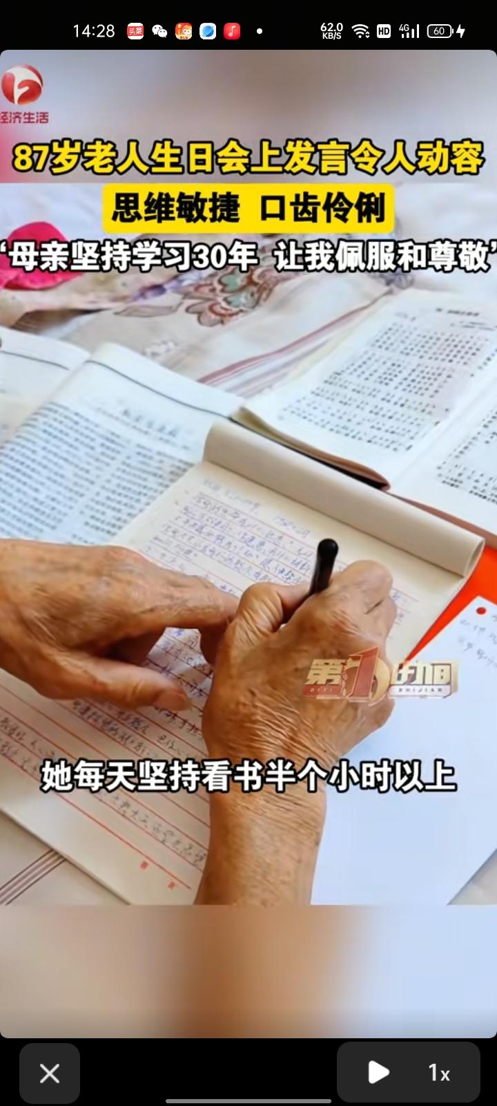 3月15日,山西太原。老人在生日会上发言,视频发出后引得不少网友的热议 女儿王女士称,母亲今年过87岁生日,思维敏捷且口齿伶俐,和她常年读书、爱动脑有很大的关系,坚持看书半小时以上,这一坚持就是三十年,对母亲打心眼里由衷的佩服和尊敬