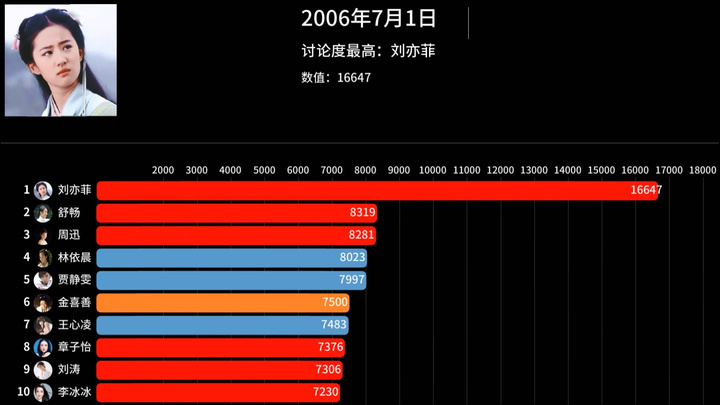 某环大陆粉丝吹00年代流量一骑绝尘,仿佛大家不是在同一个00时代,女演员比女歌手吃亏一点选秀需要投票等,女演员能在前排是真正厉害。女演员00年代数据被刘亦菲压得不能动,还在那虚假繁荣