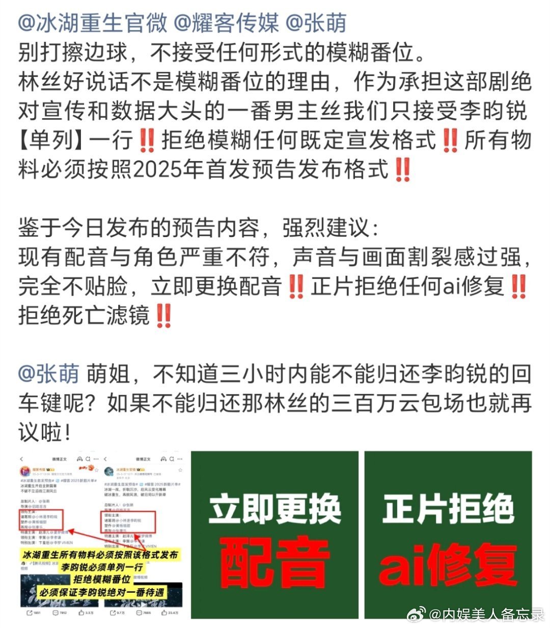 李昀锐粉丝向《冰湖重生》维权。明明小林的粉丝小森林爱剧护剧全力托举,在女主出事后依然ybc支持,却被剧方模糊番位,这种背刺谁都难以接受!