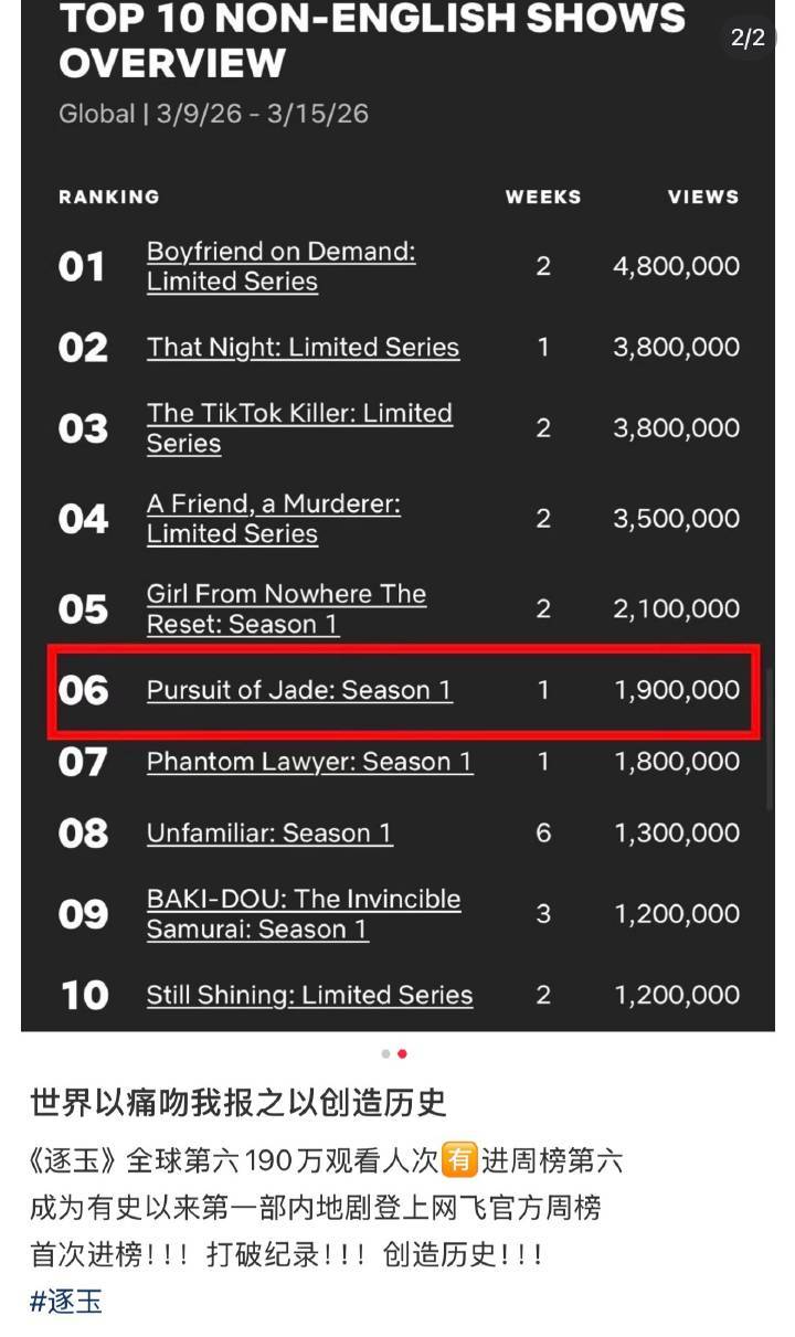 从开播到现在已经上了3000多个热搜了,而且成为有史以来第一部登上网飞官方周榜的内地剧,以 190万观看人次位列第6名,创造了国产剧出海的新纪录。好牛啊🐮