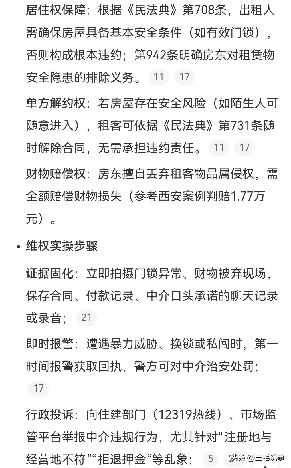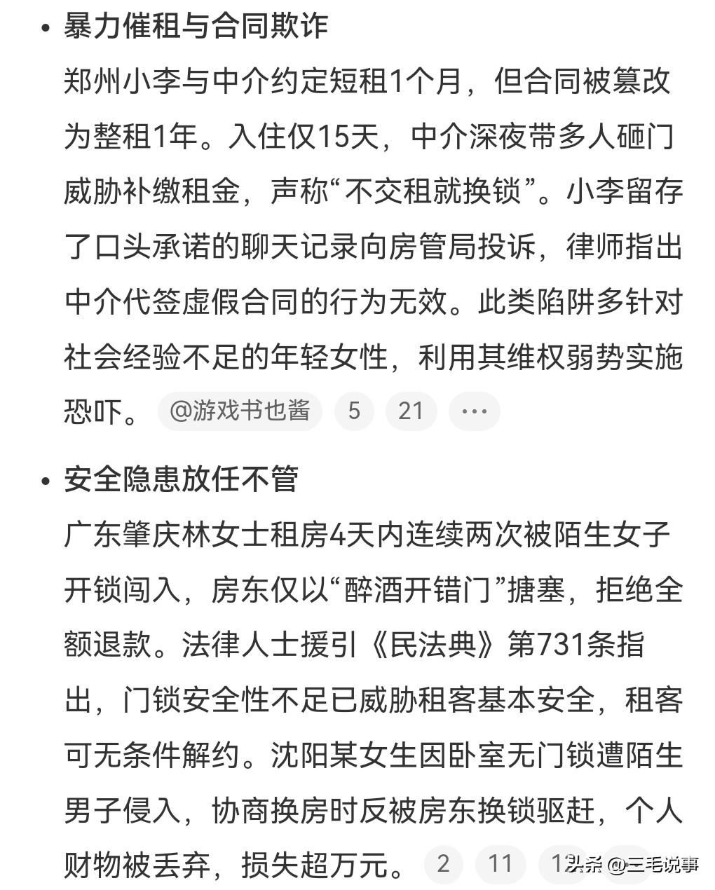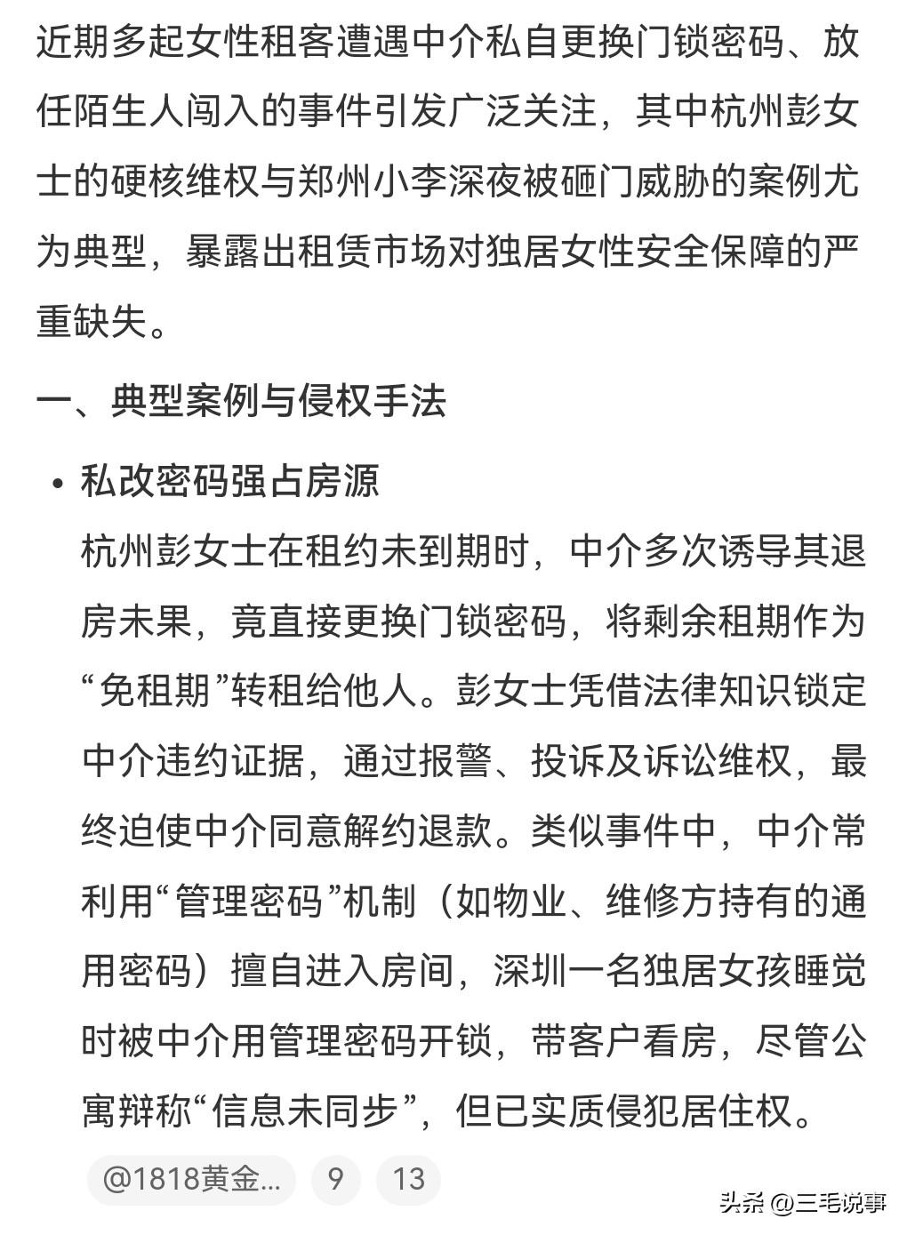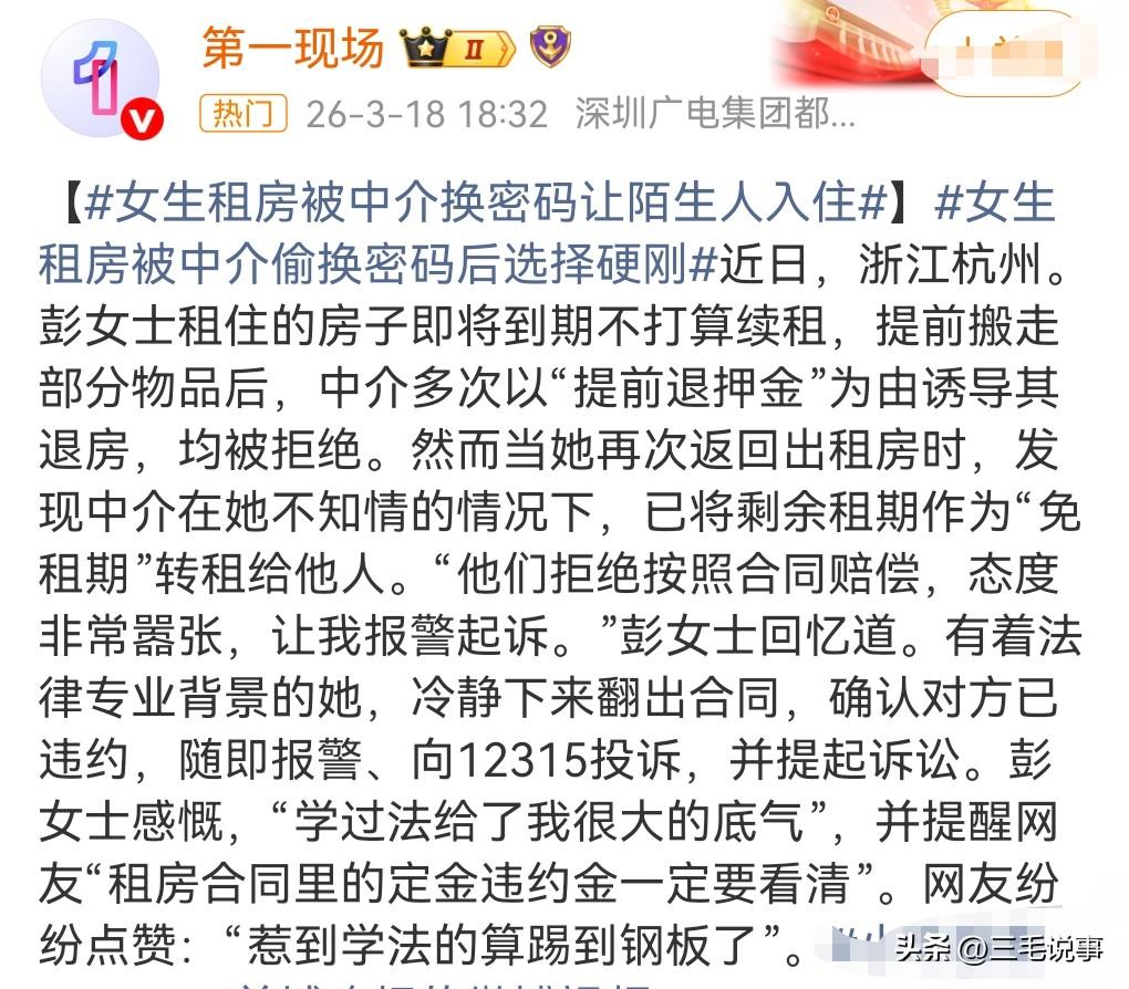 有些中介真的是相当的糟糕,租户还没有合同到期户,竟让别人住了,这真的是太没契约精神了,必须惩罚。中介把密码都给偷偷的换掉了,让陌生人入住。女生选择了报警也选择了投诉,因为她学过法律她,知道怎样维护自身合法权益,最后还选择了起诉。 这是近日发生在浙江杭州的一件事情。 中介还很嚣张,说要女子去报警投诉。 这样的事情不是个例,而是很多女性都遭遇过这样的情况,中介突然就更换密码放任陌生人闯入。这些中介真是无法无天。为了赚钱真的是一点都不在乎租客的利益。有的甚至还砸门威胁租户, 还有的竟然合同欺诈,本来是签约的一个月,没想到被篡改成了一年,中介这样的行为实在是太丧心病狂了。 租房的坑真的是太多了,这个提灯定损的事情那真是让人瑟瑟发抖啊。