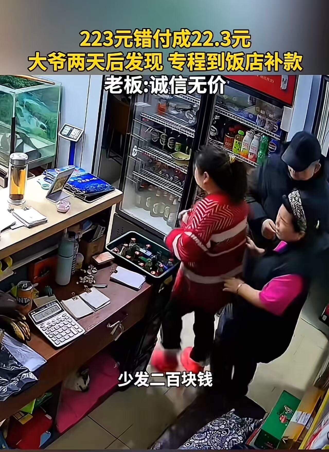 “这才是老人该有的样子!”大爷来到饭店,跟老板说自己付错钱了,老板下意识地以为他付多了,问大爷多给了多少钱?没想到大爷说:“是我给少了!223元错付成了22.3元!”老板一脸吃惊,钱给少了还特地送过来? 这件小事,看似平凡,却在当下这个快节奏、讲效率的社会中,显得格外珍贵,也让人忍不住泪目。多少次,我们在生活中遇到这样或那样的“占小便宜”现象,多少人为了省几块钱,宁愿选择蒙混过关,甚至对诚信视若无睹。而这位大爷的举动,却如清风拂面,带来久违的温暖和感动。 想象一下,当老板听到大爷说“我付少了钱”时,他的震惊和感动交织——这不仅是对金钱的尊重,更是对做人底线的坚守。223元并不是一个小数目,尤其在当下物价飞涨的时代,这笔钱对许多人来说可能意味着一天的生活开销。但老人选择亲自送来,弥补这个差额,这背后透露出的,是一种对诚信的执着和对社会公德的维护。 这让人不禁反思:诚信到底意味着什么?它不仅仅是法律上的义务,更是人与人之间最基本的信任和尊重。正是有了这样的信任,社会才能正常运转;正是因为有了这些看似微不足道的善意,生活才不会变得冰冷无情。 更令人敬佩的是,这样的老人身上还体现出一种责任感和自律。他们没有选择逃避,没有推诿责任,而是勇敢地面对自己的错误,主动纠正。这种精神,恰恰是现代社会最需要的“正能量”。在浮躁和功利渐渐占据主导的时代,这份纯粹的诚实和善良像一盏明灯,提醒着我们什么才是值得珍惜的品质。 网友们看到这则故事后,纷纷留言点赞:“这样的老人,真是年轻人的榜样!”“诚信,是社会最宝贵的财富。”“希望我们都能像大爷一样,做一个有担当的人。” 然而,这样的故事也让人感到一丝无奈和心酸——在现实生活中,多少次我们因为小小的利益而选择了不诚实?多少次,诚信被现实的利益冲突所侵蚀?这位大爷用行动告诉我们,诚信不是一句空洞的口号,而是每个人都能做到的生活细节。 也许,我们每个人都应该从这件事里学到些什么。在快节奏的生活中,不忘初心,坚守诚信,才是对自己和社会最大的负责。你有没有遇到过类似让你感动的“诚信故事”?欢迎在评论区分享你的经历和感受,让我们一起传递这份珍贵的社会温度!