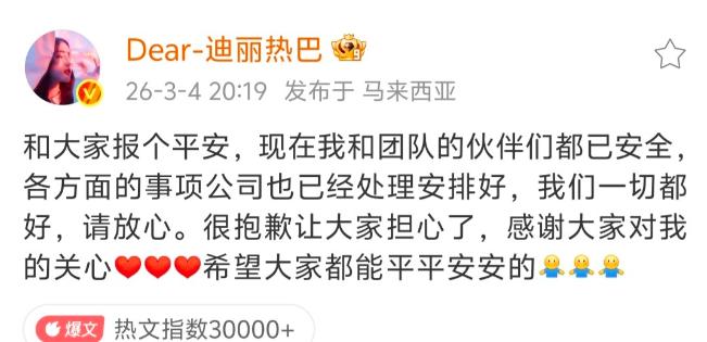迪丽热巴滞留迪拜风波后首露面。 3月18号深夜,刘冲晒了和热巴的双人合照,直言两人晚餐吃了很多聊了很多,一切都好。 照片中,热巴双手托腮,脸色泛红,看上去像是喝了不少。 回看热巴上一次的公开照片,还是巴黎时装周的出发图,在这之后,兜兜转转发生了太多,热巴也只是文字报了次平安,再无音信,如今看到新鲜的热巴,挺好。 感谢刘冲老师,我终于知道她安全了,风波过后状态必须开挂,又下黑稿了,又开始洗脑热巴演技不行了,热巴平安是福。 热巴终于露面了!看照片脸色泛红像是喝了不少,但精神状态不错。刘冲晒合照报平安,IP显示在北京,看来迪拜风波后已顺利回国。兜兜转转这么久,只要人没事就好,期待她早日恢复工作状态。 看到热巴双手托腮的照片真感慨,上次还是巴黎时装周,中间发生了太多事。如今和刘冲晚餐聊天,算是正式回归大众视野。虽然脸红像喝多,但能平安回国就是好消息,希望她好好休息,别再让粉丝担心了。 刘冲这“妇女之友”名不虚传,好多女明星都和他关系亲密。这次晒出和热巴的合照,直言聊了很多,间接证实热巴已回国。不管是为了资源还是真友谊,能帮明星澄清传闻也是好事,看到热巴安好就放心了。