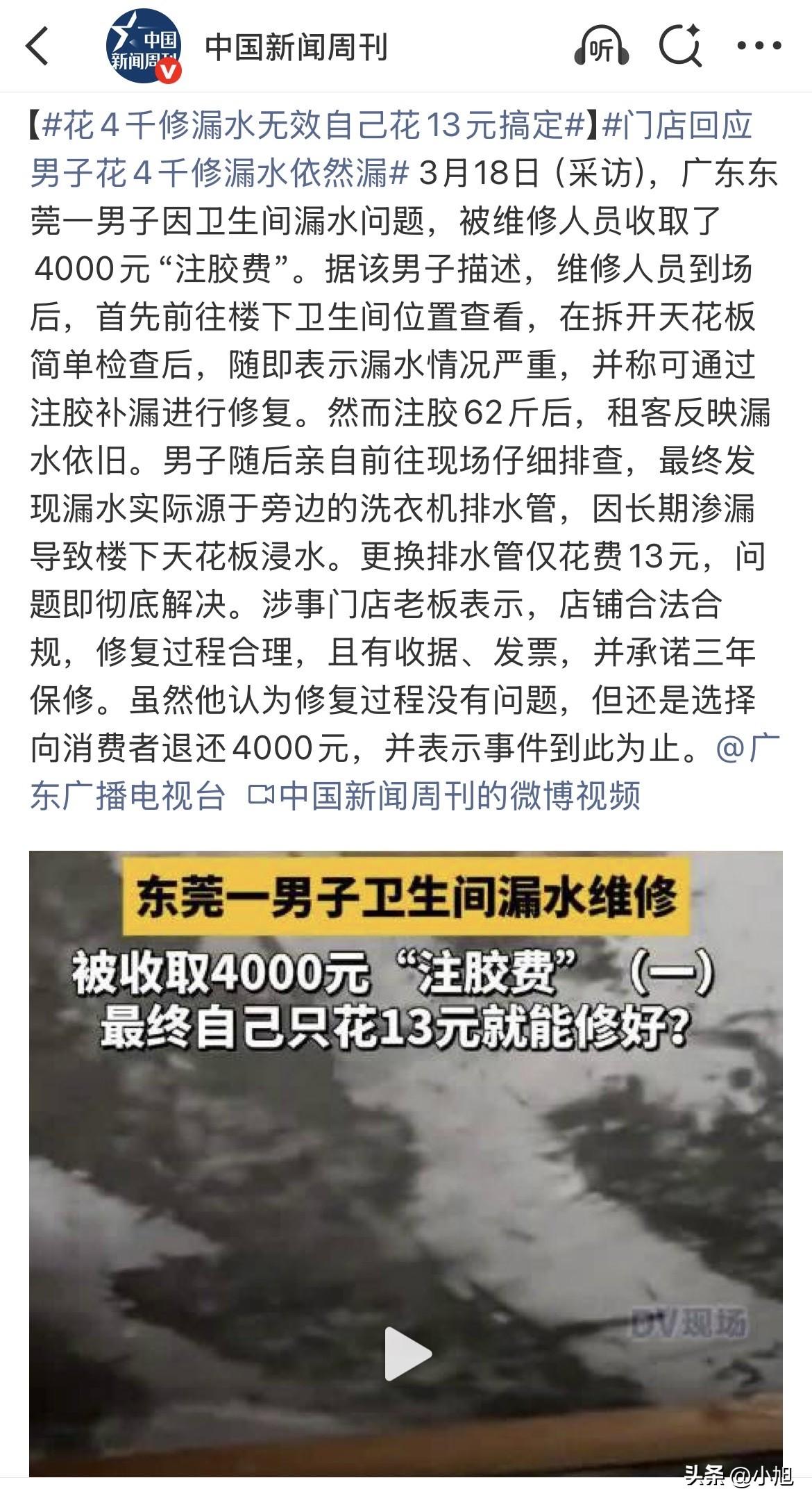 广东东莞一个房东陈先生,这几天心里一直不踏实。楼下租客又打电话来了,说卫生间天花板还在滴水,跟没修之前一模一样。陈先生放下电话,脑子里嗡嗡的,他刚花了4000块钱请人修漏水,这钱是白花了? 事情还得从一个星期前说起。陈先生在东莞厚街有套房子出租,前阵子租客说楼下邻居投诉,卫生间漏水到人家天花板上了。陈先生赶紧上网找维修,很快联系上一家店,师傅第二天就上门了。 师傅一来,先让陈先生带他去楼下邻居家。他拆开卫生间天花板,打着手电筒照了照,上来就跟陈先生说,你这漏水严重啊,得赶紧处理。陈先生问怎么修,师傅说现在都用新技术,不用砸瓷砖,往地板里注胶就行,胶水能把所有缝隙都堵死。 陈先生问多少钱,师傅说胶水80块钱一斤,你家这种情况用不了几斤。陈先生想想,几百块钱能搞定的话,倒也省事,就点头同意了。 师傅开始干活,搬出设备往地板里注胶。陈先生在旁边看着,心里还嘀咕这技术挺先进。活干完了,师傅拿账单给他看,陈先生接过来一瞧,愣住了——4960块。 师傅解释说,你家地板底下空鼓严重,一共注进去62斤胶水,按80一斤就是4960。陈先生觉得太贵了,跟师傅商量能不能便宜点。两个人讨价还价半天,最后讲到4000块。陈先生付了钱,师傅走的时候还说,放心吧,保修三年。 陈先生当时虽然心疼钱,但想想能把问题解决了也值。谁知道这才过几天,租客又说漏水,他这心里又气又纳闷,到底哪儿出了问题。 陈先生决定自己跑一趟,把事情弄个水落石出。他先到楼下邻居家,爬上去看天花板,确实还在滴水。他又回到自己那套房子里,把卫生间里里外外看了个遍。 最后他发现,问题根本不在卫生间地面。卫生间旁边放着洗衣机,洗衣机那根排水管老化了,管子壁上裂了一道小口子,每次洗衣机排水,水就从裂口渗出来,顺着墙流下去,刚好滴到楼下邻居的天花板上。 陈先生蹲在那儿看着那根破管子,心里说不出什么滋味。他跑到附近五金店,花了13块钱买了根新管子,回来自己动手换上。再给楼下打电话问,那边说天花板干了,不漏了。 13块钱解决的问题,他花了4000。陈先生越想越不是滋味,第二天拿着那根破管子找到那家维修店,想讨个说法。 店老板倒是很镇定,把他请进店里坐下来谈。老板说,我们店是正规注册的,有营业执照,施工过程没有任何问题,该走的流程都走了,该给的发票也给了,还承诺三年保修。老板还说,虽然我觉得我们没问题,但既然你觉得不满意,我愿意把这4000块钱退给你,这件事就到此为止。 陈先生拿着退回来的4000块钱走出店门,心里反而更复杂了。老板退钱退得这么痛快,到底是因为理亏,还是觉得多一事不如少一事? 这件事有几个细节值得琢磨。师傅当初到楼下拆天花板检查,这一套动作看起来确实专业,让陈先生觉得这人靠谱。但问题在于,师傅检查完之后,并没有顺着漏水的痕迹往楼上排查,没有去看看水到底从哪儿来的,而是直接给出了注胶的方案。 62斤胶水注进地板里,后来发现漏水原因是根破管子,这62斤胶水到底起什么作用了,没人知道。有媒体调查过类似的"注胶堵漏"骗局,那种胶水成本其实很低,央视新闻曾经报道过,有的成本才每斤2块钱,卖给消费者能到200块钱一斤。而且这种注胶方式对家庭防水基本没什么用,专家说只是暂时把砂浆层堵住,时间长了还会裂,继续漏。 陈先生后来回忆,师傅报80块钱一斤的时候,他心里算的是几斤的账,压根没想到会用到62斤。这其实就是这种骗局的套路,先报一个低价让人放松警惕,等干完活再按实际用量收钱,这时候消费者往往只能认栽。 店老板最后退钱了,但他始终没有承认自己有问题。他反复强调店铺合法、流程合规、有发票有保修,在他这套逻辑里,只要手续齐全,事情就算做完了。至于问题到底有没有解决,那可能就不在他考虑范围了。 陈先生后来跟朋友说起这事,朋友问他,那老板退钱的时候说了什么没有。陈先生想了想,说他就说了一句"到此为止"。这四个字听起来像是了结,但陈先生总觉得,这事儿其实还没说清楚。 大家怎么看这件事,如果是你遇到类似情况,会怎么处理? (资料来源:广东广播电视台《