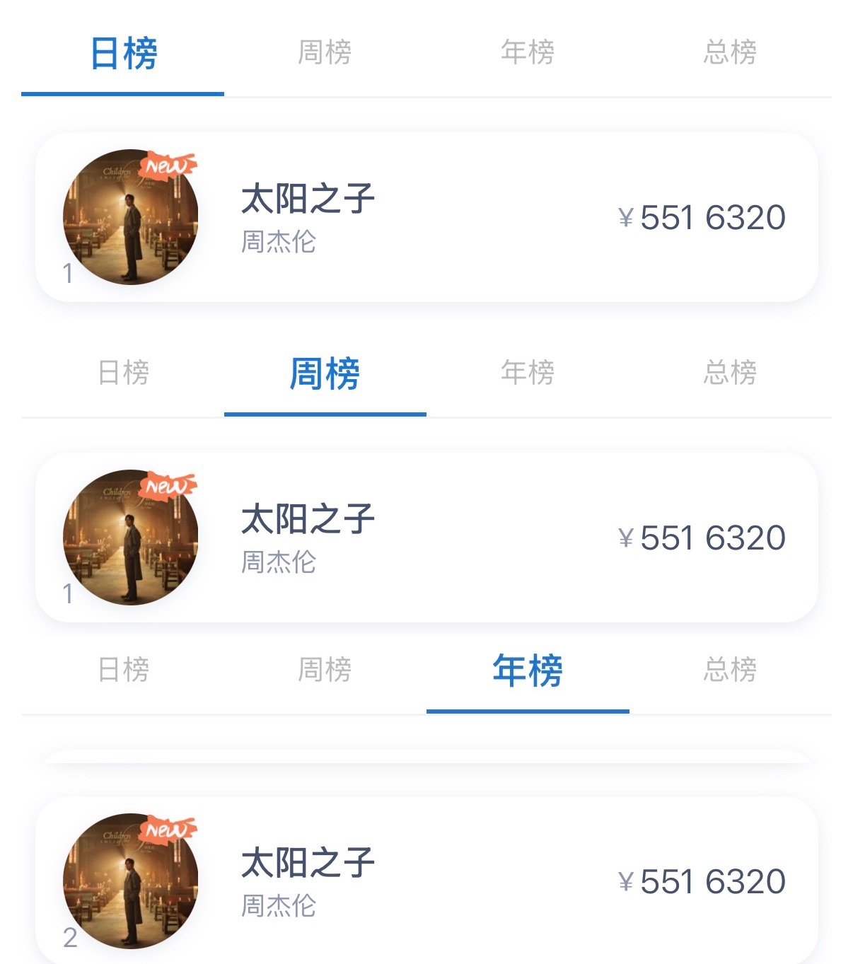 目前周杰伦新专辑太阳之子 全网销售额突破550万元。日榜,周榜第1️⃣年榜第2️⃣