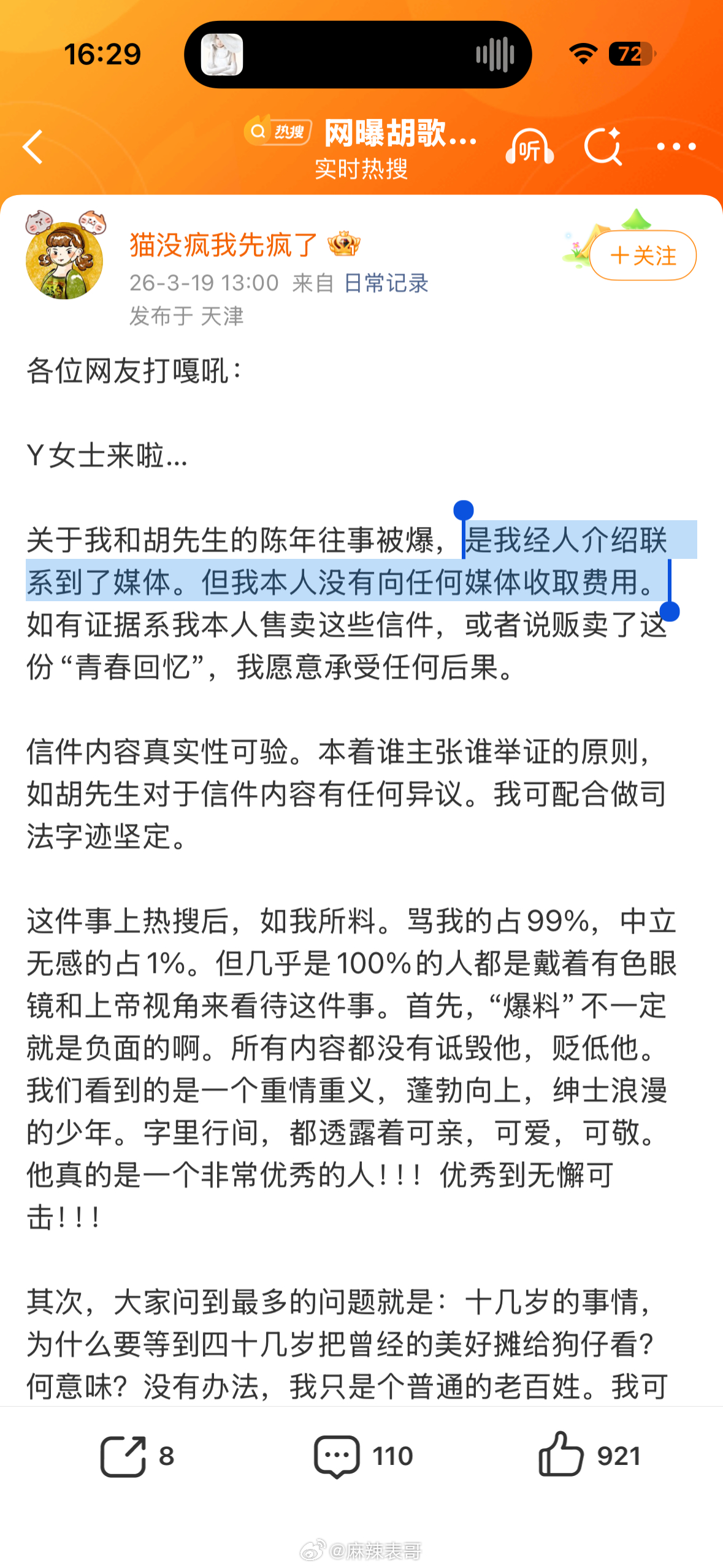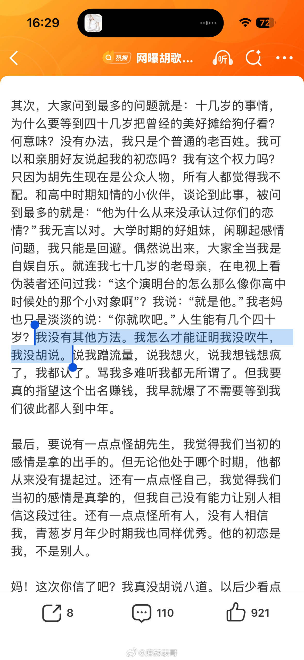 最后还大喊了一声「妈!这次你信了吧?我真没胡说八道」。有点阴阳胡歌之前发的「妈妈你开心吗,我尽力了」的感觉。