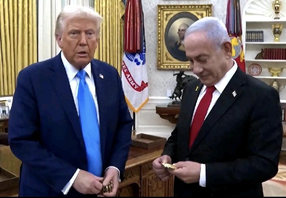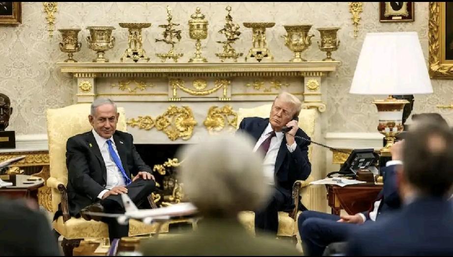 内塔尼亚胡的坐姿挺霸气,像个大老板; 谨听指教的特朗普,秒变职场小菜鸟。 特朗普