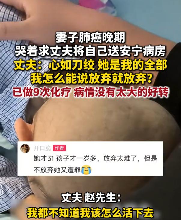 吵翻天!广西南宁,女子肺癌晚期,躺在医院的病床上非常痛苦,哭着求着让丈夫给她送到安宁病房,可丈夫却没有满足妻子的心愿,因为妻子还年轻,他还想再努努力,可这个举动,却被一些网友看作是自私 夫妻俩结婚后一直是让人羡慕的夫妻,孩子也才1岁多,原本幸福的日子才刚刚开始,结果妻子却查出了肺癌晚期,而且伴有淋巴转移和骨转移,已经没法手术,经过九次化疗,妻子的病情也不见好转,反而身体的情况越来越差 妻子看着丈夫每天忙前忙后,请了长假在医院守着,而自己的疼痛也越来越多,就求着丈夫把自己送到安宁病房 可在丈夫心里,妻子就是他的全部,是他支撑着走下去的勇气,放弃什么都可以,唯独放弃妻子,他做不到,在她看来,妻子还年轻,孩子也还小,不能就这样放弃 有网友认为:尊重当事人的愿望才是真正的尊重,却总有人会去做一些于事无补、自我感动的事情 也有网友说,换位思考一下,让你亲手放弃自己最爱的人,你做得到吗?站着说话不腰疼 其实哪有那么多非黑即白 旁观者可以轻松地说尊重本人意愿。可对赵先生来说,这个决定不是签一个字那么简单。签下去,就意味着承认自己的无能为力,意味着从此天人永隔,意味着他这辈子都要问自己:如果当初我再坚持一下,会不会有奇迹? 而妻子的选择,也不是简单的放弃。她是用自己最后的日子,在给丈夫和孩子留一条生路 这世上有些事,本来就没有标准答案 安宁病房不是什么可怕的地方,它只是让人走得舒服一点,少受一点罪。赵先生不愿放手,也不是什么罪过,他只是太爱这个人,爱到舍不得让她走,哪怕多留一天是一天